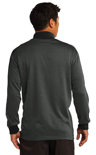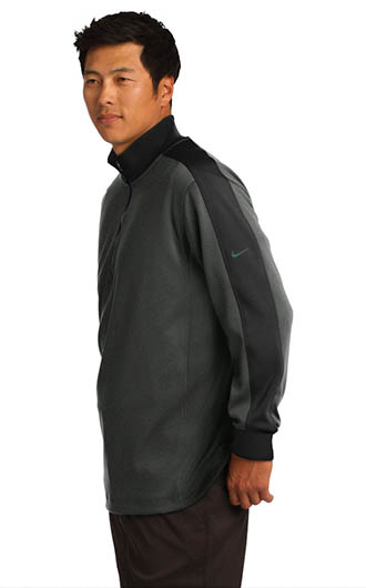 A boldly striped inner collar and reverse coil zipper give this cover-up an edge. Of course, it also performs with Dri-FIT moisture management technology. The design features a flat knit collar and cuffs and an open hem. The contrast Swoosh design trademark is embroidered on the upper left sleeve. Made of 8.3-ounce, 100% Dri-FIT polyester. Due to the nature of cotton/polyester blends in dark and neon colors, special care must be taken throughout the decoration process when heat is applied for curing. Please consult with your decorator or material supplier. Your price includes embroidery on the left chest.