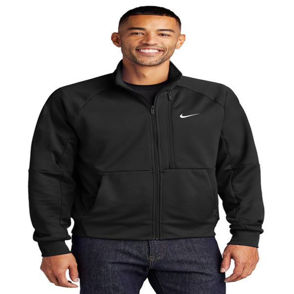 Nike designed this jacket with sustainability in mind because it's made from at least 75% recycled and/or organic content. Details include a dyed-to-match reverse coil zipper and an elongated vertical zippered left chest pocket. Front pockets, rib knit cuffs and rib knit hem complete the look. A contrast Swoosh logo is embroidered on left chest. Made of 6.2-ounce polyester fabric. Price includes embroidery.