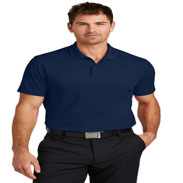 Built from 100% recycled polyester fabric, Nike scores a victory for sustainability and performance in this sophisticated polo engineered with Dri-FIT moisture management technology.. 4-ounce, 100% recycled polyester fabric. Flat knit collar. Two-button placket. Dyed-to-match buttons with 60% recycled content. Open hem sleeves. Open hem. Contrast heat transfer Swoosh logo on left sleeve. Price includes embroidery.