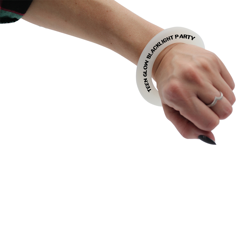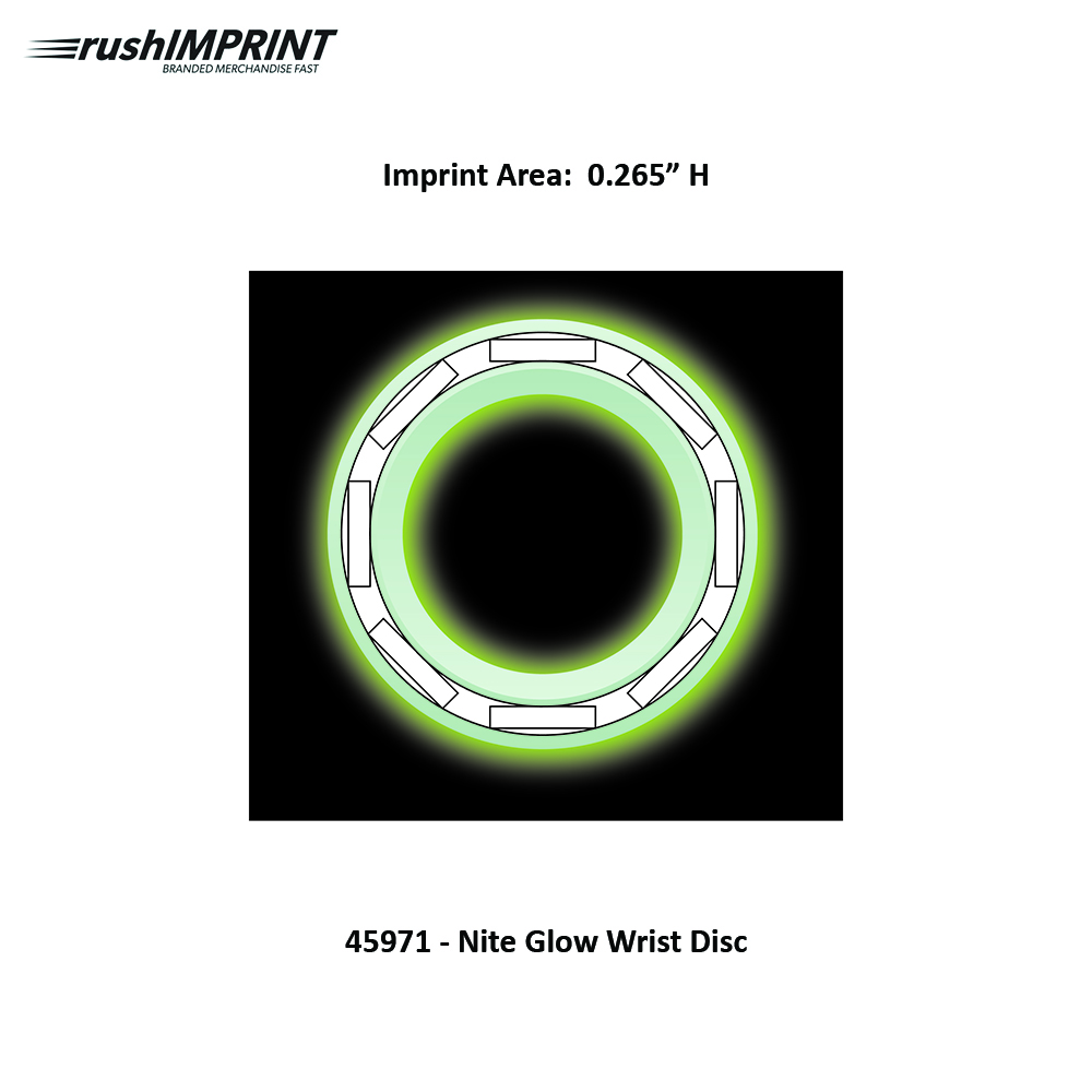 Glows in the dark. 360 degree imprinting included. Wear on wrist, one size fits most. Double as a throwing disc. Made of silicone. Great for relieving stress by stretching the disc. Makes a great tradeshow handout. Safety tracking information printed on backside/inside of disc. Patent Pending. Price includes one color, one location imprint.