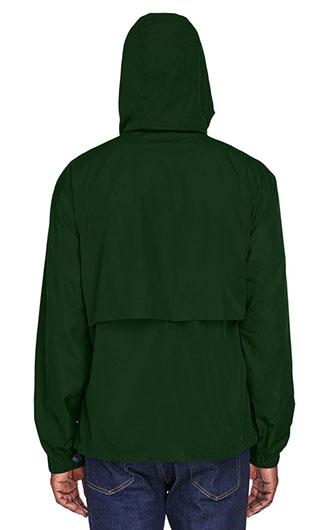 Fabric: Water resistant finish. LINING: 100% polyester mesh in upper back. 100% 240T polyester, 2.7 oz./yd2/90 gsm. Features: Roll-away hood. Vented back yoke. Adjustable cuffs with tabs. Adjustable shockcord at hood and hem. Your price includes embroidery on the left chest.