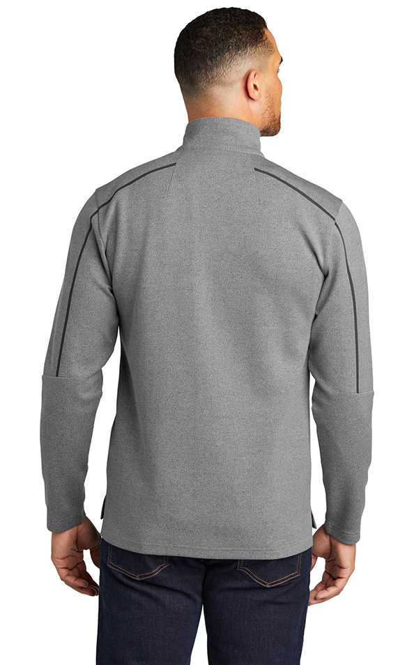 Transition easily between a corporate look and afterhours style in this double-knit piece that has OGIO edge. 11.4-ounce, 52/45/3 cotton/poly/spandex fleece. OGIO heat transfer label for tag-free comfort. Black grosgrain detail at zipper. Metal molded zipper with debossed O on zipper pull. Seaming details. Matte black debossed O metal badge on front left hem. Price includes embroidery.
