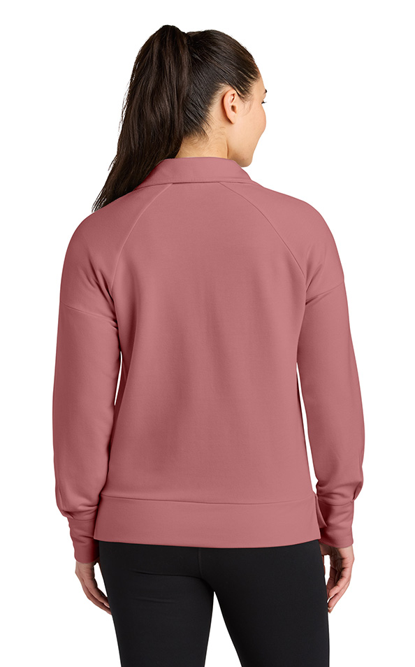 Whether worn after training or as a corporate layer, this 1/2-zip offers casual-comfort perfection. 7.1-ounce, 57/38/5 modal/polyester/spandex. Metal zipper and O icon metal pull. Drop shoulder. Blouson sleeves. Banded hem with side vents. Metal die-cut O icon at hem. Price includes embroidery.