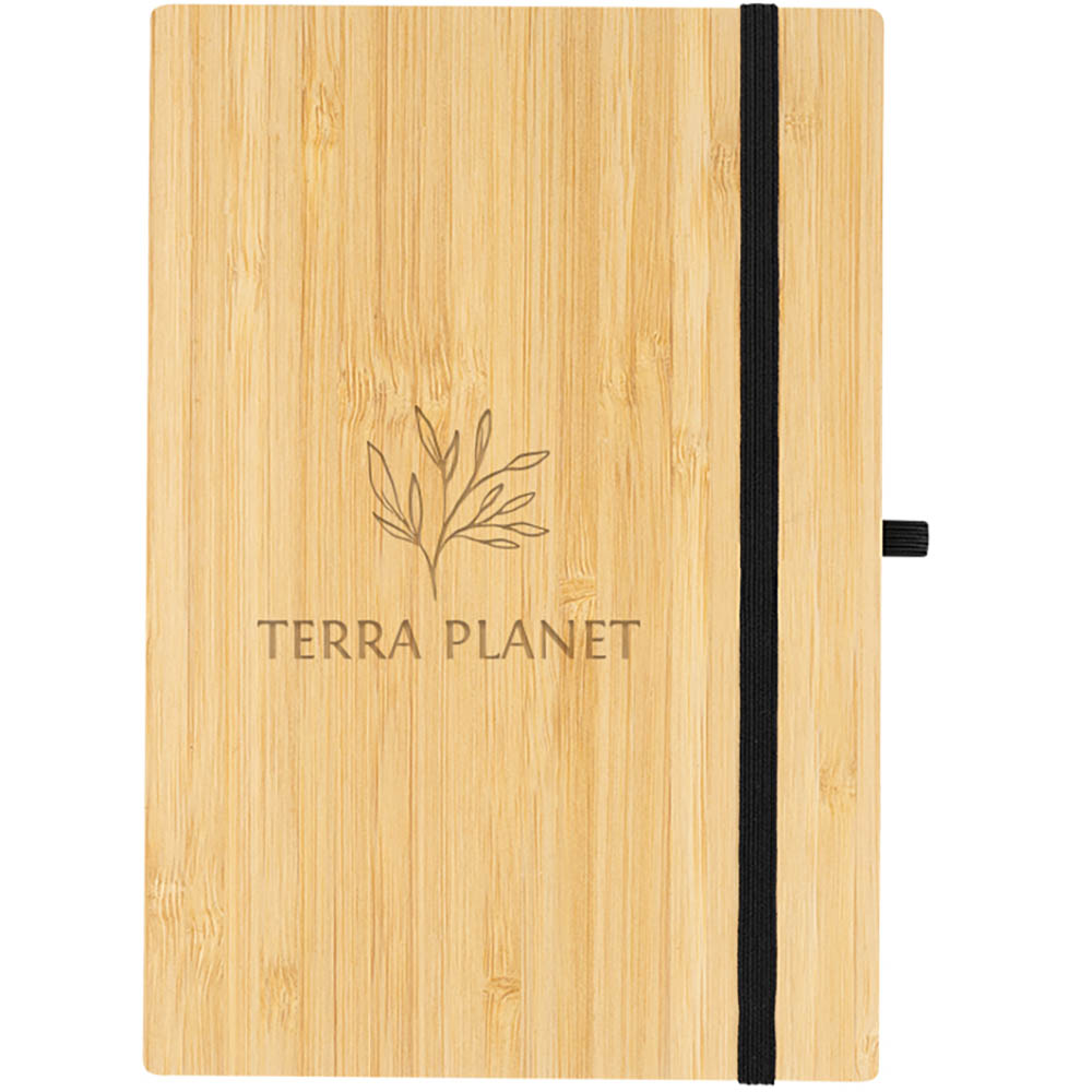 100 Page Lined Journal. Bamboo Cover. Strap Closure And Pen Loop. Supports Responsible Forestry. FSC Certified. FSC Certified Products Are Made With, Or Contain, Forest-Based Materials Sourced From Forests That Have Been Audited By An Independent Third Party To Confirm They Are Managed According To FSC's Rigorous Social And Environmental Standards. Price includes laser engraving.
