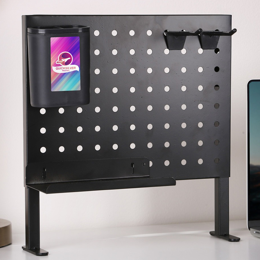 Say hello to your new desktop organizer, the Peggie Peg Board Desktop Organizer! This stylish organizer blends seamlessly into any workspace while offering maximum functionality. With a metal peg board featuring a cup holder, tray, and two hooks, keeping your essentials in order has never been easier. Effortless desktop organization made stylish with the Peggie Peg Board. Peg board equipped with cup holder, tray, and two hooks for versatile storage. Crafted from sleek, black metal. Customize with full-color decal placed on the front of the pen holder cup. Price includes full color imprint.