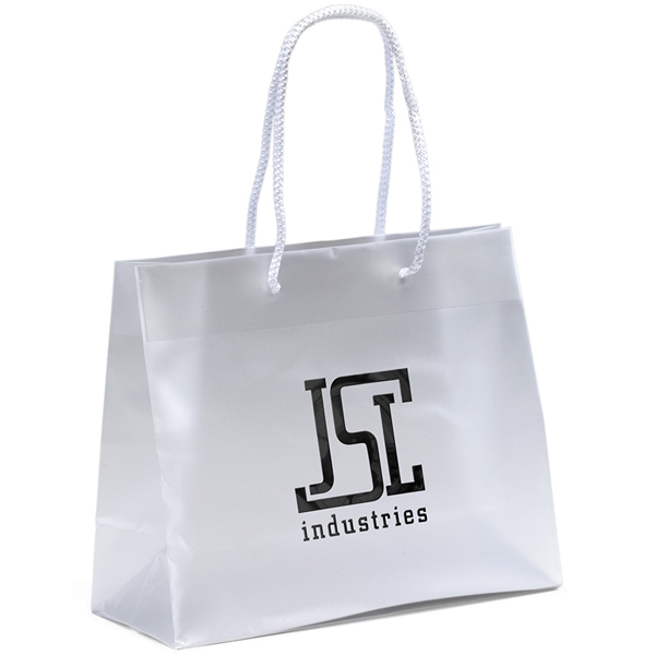 High density frosted plastic bag with knot-tied macram handles, reinforced fold-over top, side and bottom gussets, and cardboard bottom insert. Price includes 1 color foil stamp imprint. Free Proof prior to production.