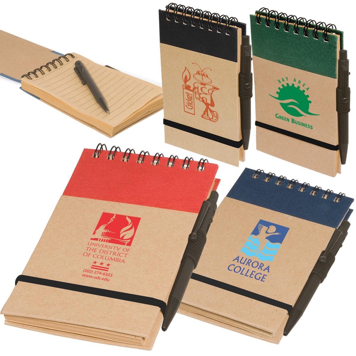 An Eco-Responsible(TM) Product. Features a cardboard cover made from recycled paper, 60 pages of ruled, recycled paper, elastic closure, metal ring binding and elastic pen loop. Micro-Writer pen included.