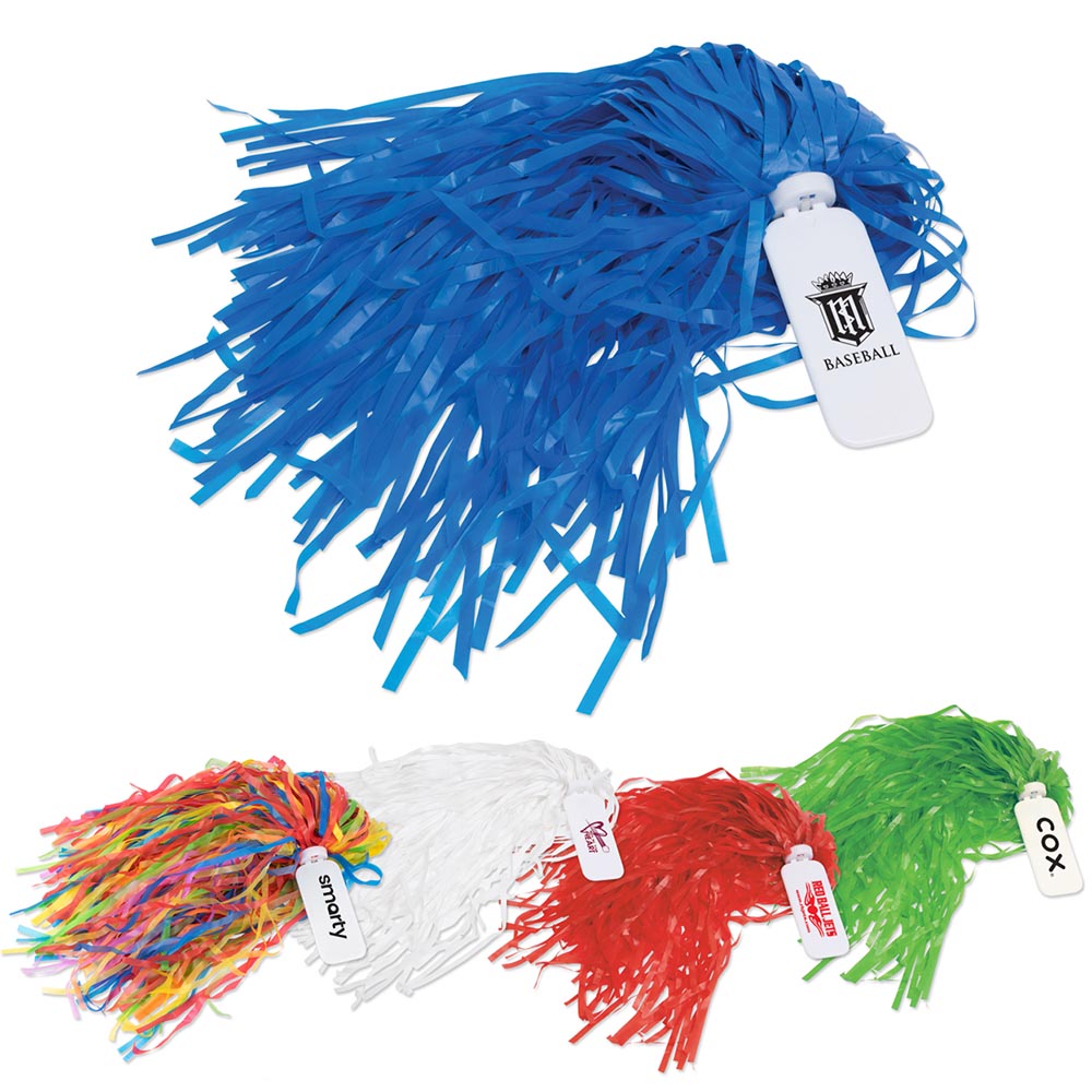 Get ready to cheer with our pom poms! Available in red, white or blue, our pom poms are a fun way to get your logo noticed. Great for schools, sporting events and company celebrations. An ideal giveaway at tradeshows, this creative promotional product brings joy to people of all ages. 450 strands per pom pom. Available in blue, red, green, white and rainbow. Price includes one colour, one location imprint.