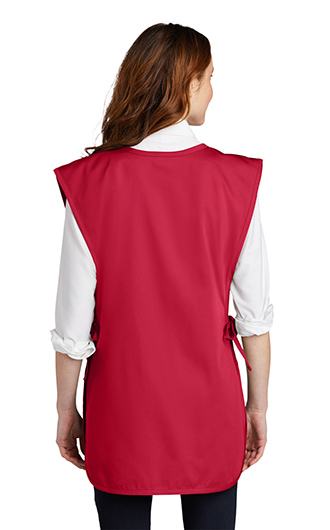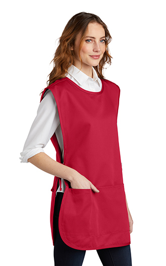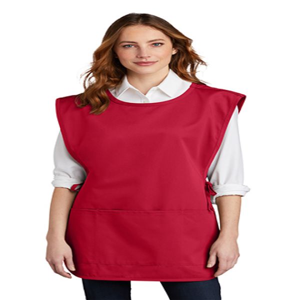 Enjoy crafting, cooking or serving in this easy care apron that shields your clothes from stains. 8-ounce, 65/35 poly/cotton twill. Three front pockets. Adjustable side ties. 18"w x 32"l (S/M); 22.5"w x 36"l (L/XL). Price includes embroidery up to 5k stitches.