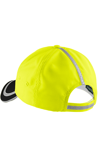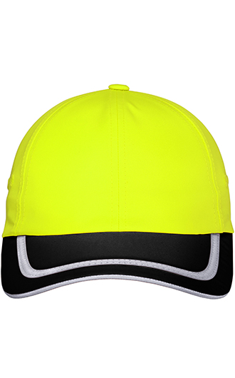 This cap has reflective taping in the sandwich, top of bill, back crown and closure. Fabric: 100% fluorescent polyester. Structure: Lightly structured. Profile: Low. Closure: Hook and loop.