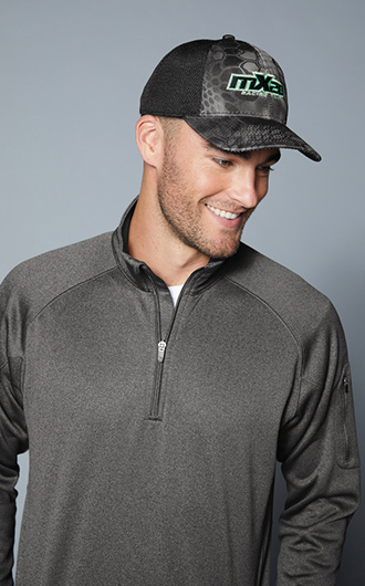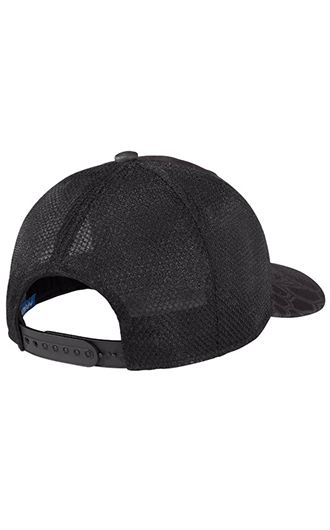 Fabric: 87/13 poly/spandex front panels; 100% polyester mesh mid and back panels. Structure: Structured. Profile: Mid. Features: Moisture-wicking. Closure: 7-position adjustable snapback.