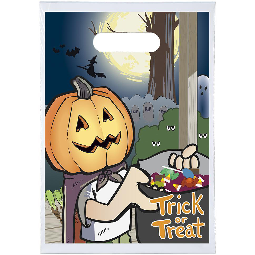 New digital full-color Halloween stock designs are printed on both sides of this 2.0 mil white plastic bag. This recyclable bag features non-reinforced die cut handles and no gusset. Add your custom imprint to the second side above the safety tips. Price includes full color imprint.