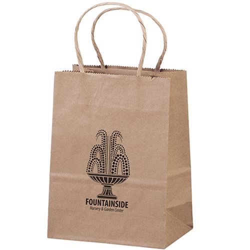 Brown kraft shoppers made from 100% recycled paper (with a minimum of 95% recycled post-consumer content) with matching twisted paper handles and serrated cut top. Price includes one color imprint, one location. Free Proof prior to production.