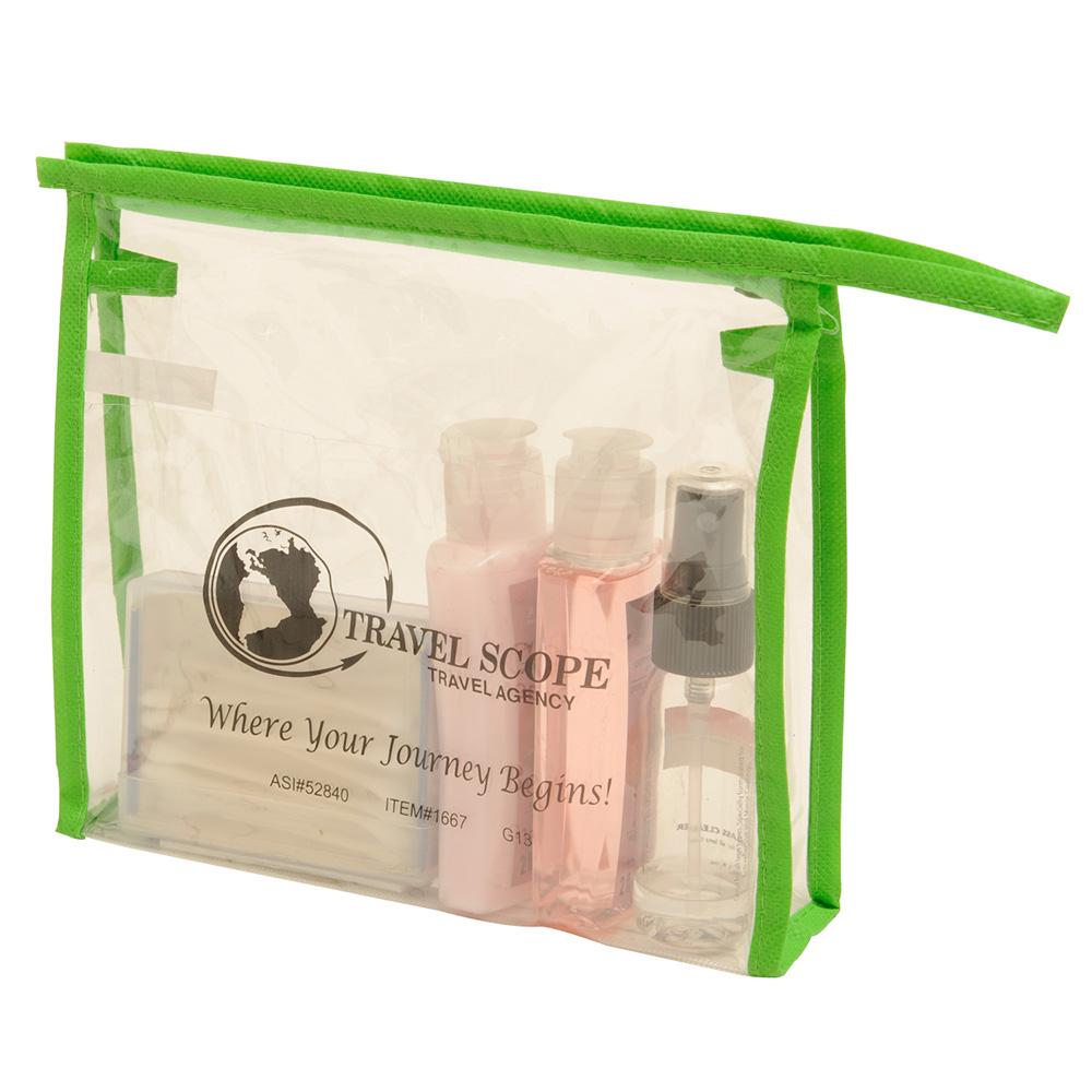 Constructed of clear PVC and non-woven colored accents. Top zippered closure and pocket on front.