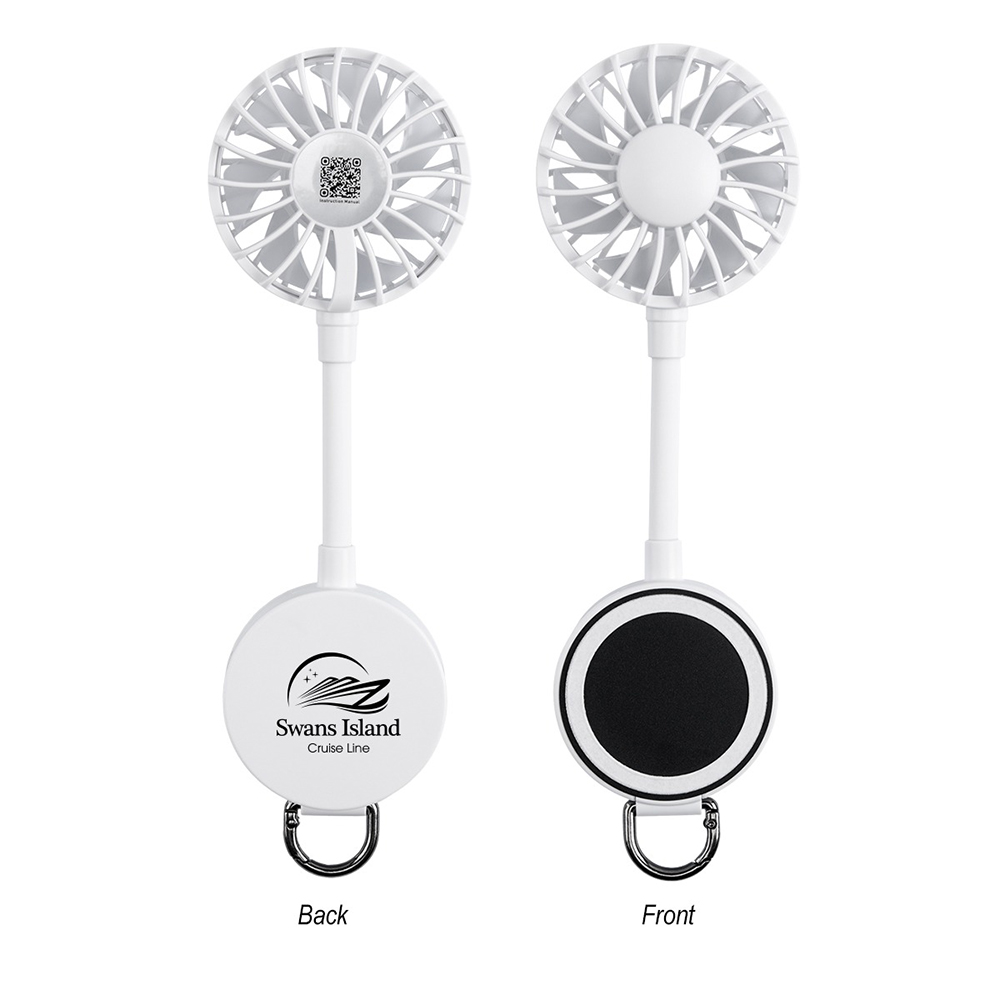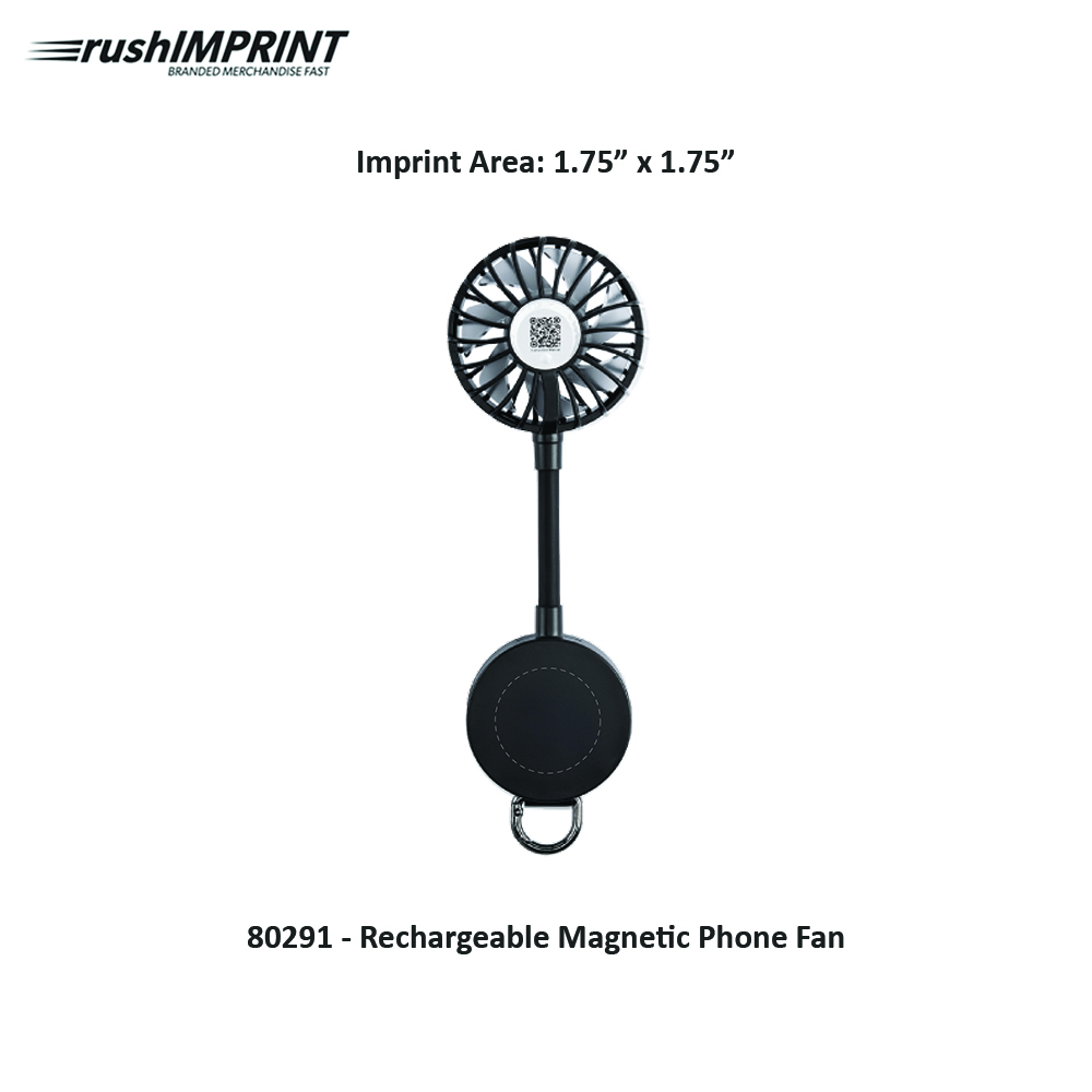 Adheres To The Back Of Your Device Magnetically. Adhesive Ring Included For Non-Magnetic Phones. Adjustable Tilt. Carabiner Attachment For Attaching To Bags, Keys, Etc. Carabiner Not For Climbing. Push Button To Power On/Off And Change Settings. 3 Speeds - High, Medium & Low. Charging Time Approximately 1 1/2 Hours. Run Time Approximately 1 - 3 1/2 Hours, Depending On Fan Speed 900 mAh Lithium Battery. Features A Type-C Input (Cord Included). Price includes one color, one location imprint.