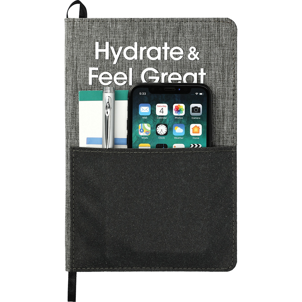Made of post-consumer recycled fabrics, the 5.5" x 8.5" FSC® Mix Reclaim Recycled Bound JournalBook® features a RPET hard cover with recycled leather front pocket for storing documents, smartphone, and other essentials. This notebook includes 80 sheets of FSC® Mix recycled white paper and a back document pocket. This item contains 85% of recycled material. Through a partnership with 1% For The Planet, one percent of sales of this and all EcoSmart products will be donated to nonprofits dedicated to protecting the planet.