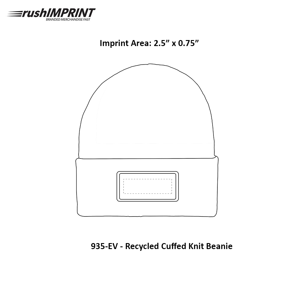 Constructed of recycled polyester & acrylic. Cuffed knit beanie with patch. One size fits most. Price includes one color, one location imprint.