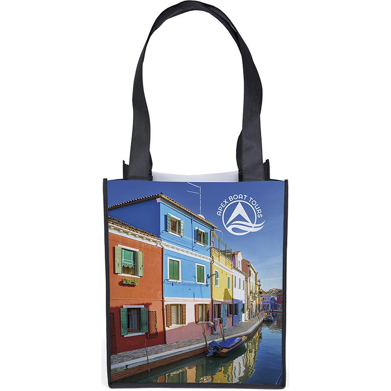 This 80 GSM PET non-woven bags features white front and back panels, accented by black gussets, piping, and handles. 1.5"-wide x 28"-long handles. Price includes a Full Color Imprint on one side, second side is available at additional costs please call with questions. Free Proof prior to production.