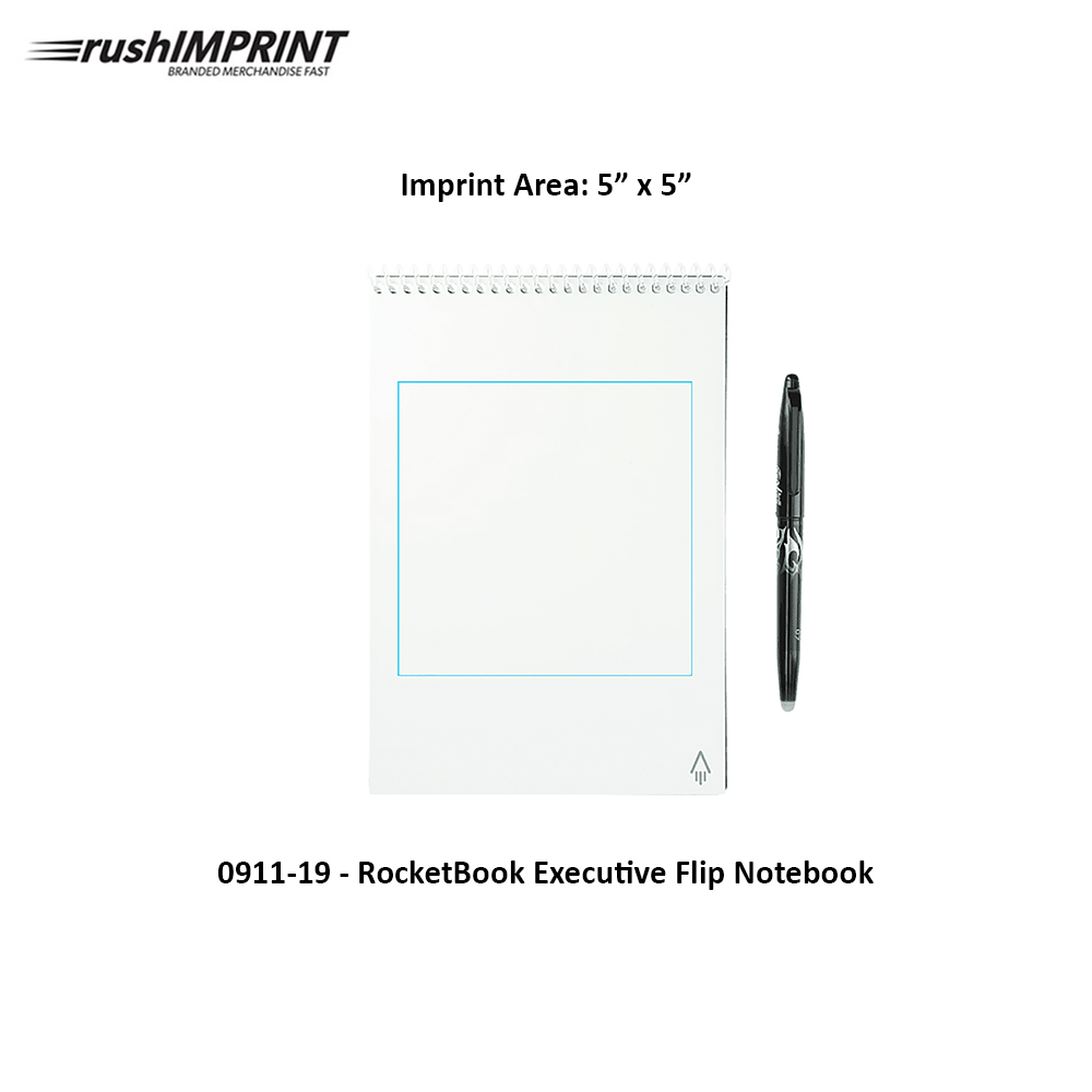 The RocketBook Executive Flip Notebook Set is designed for the modern business professional. Its white lined, college ruled, dotted paper is made from synthetic polypropylene materials and allows you to write smoothly using the included Pilot Frixion pen. When you're done writing, the RocketBook Notebook magically wipes clean with a damp cloth to reuse again and again! Use the RocketBook app to back up your notes, plans, lists, and big ideas to your preferred cloud storage service. Then, erase and reuse your Flip to record and share your next great idea. Material: Polypropylene. Reusable design wipes clean with a damp cloth. Comes with an app that lets you upload and store your notes. Compatible with the included Pilot Frixion Pen. Great for note-taking, brainstorming, and more. Price includes one color, one location imprint.