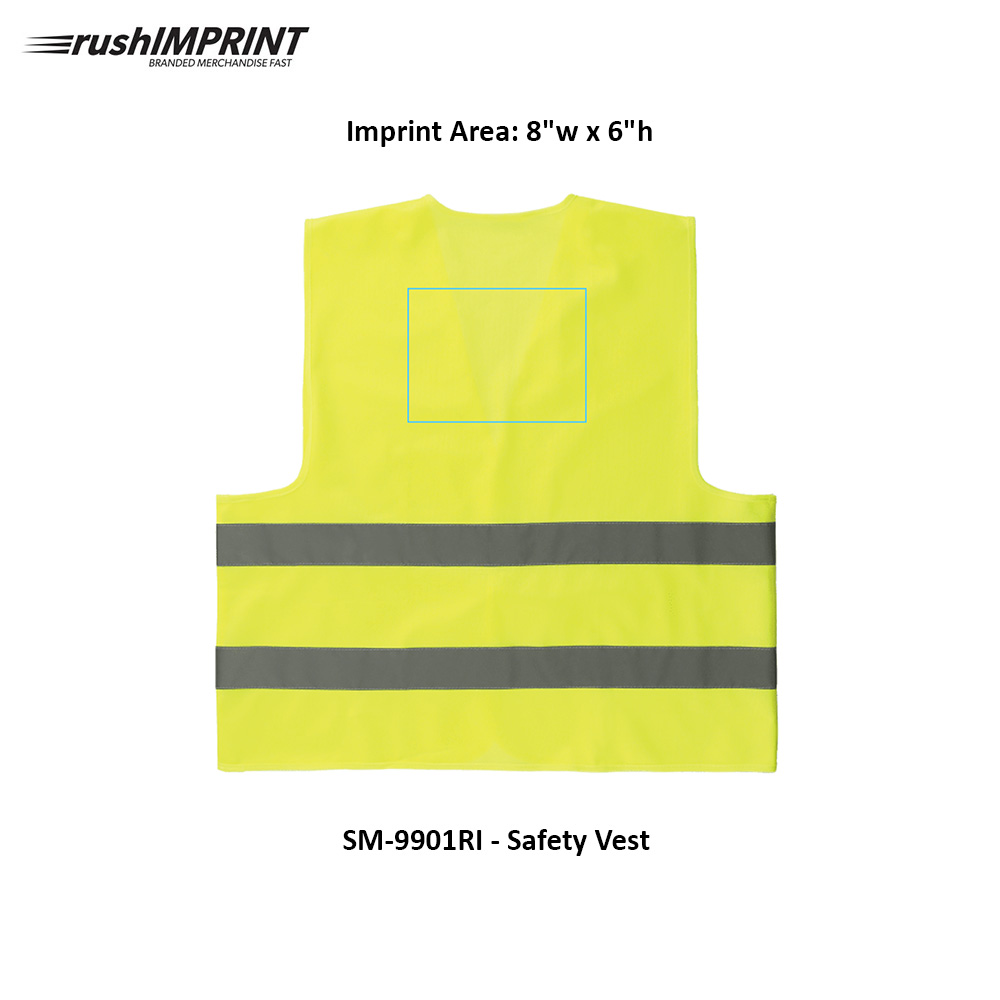 The Safety Vest is a neon yellow safety vest with reflective stripes. One size fits most up to XL. Hook and loop closure on the front. MATERIAL: Polyester. Price includes one color, one location imprint.