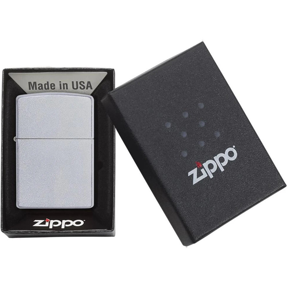 The satin chrome finish provides a silky luxurious feel for a refined look. Backed by Zippo's Lifetime Guarantee. Made in USA. Packaged in a gift box. Price includes full color imprint.