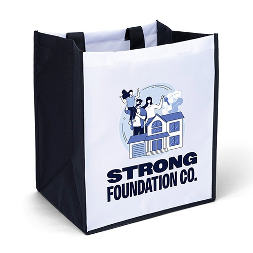 The Scott Heavy-Duty Polyester Tote (13W x 10 x 15H) is a 600-denier polyester bag with white front and back panels that offer a generous imprint area on both sides of the bag. The tote features a 28"-long black handle with black gussets and piping. The durable but affordable tote fabric is tear-resistant. Price includes full color imprint.
