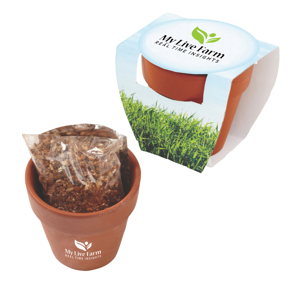 Our Terracotta Pot Planter is nothing short of adorable! It comes individually packaged in a preprinted sleeve making it a perfect giveaway! Simply remove the seeds from the packet, plant under a layer of good soil (provided), water daily and watch your seedlings sprout! Typical germination time ranges from 1-3 weeks (time may vary) Instructions are included on the preprinted sleeve. Price inludes 1 color imprint.