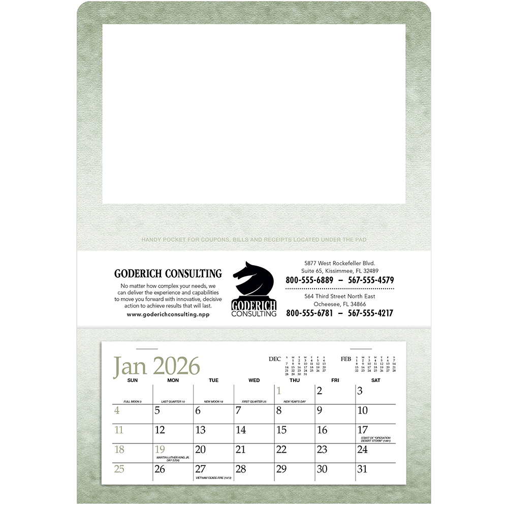Model: 4205 Single Pocket Calendars View Imprint Area Product Description Great value and great versatility! This calendar folds for convenient distribution as a self-mailer and stores easily in a filing cabinet when the year is over. The single pocket is ideal for bills and memos. Price includes one color imprint. Size: 13"h x 9"w Imprint Area: 1.75"h x 7.75"w Request A Virtual Proof Request A Free Sample Choose Quantity View Price Breaks Quantity Price 100 $3.50 250 $2.99 500 $2.53 750 $2.22 1000 $2.12 2500 $1.87 5000 $1.72 Enter quantity or drag slider. Minimum quantity is 100. Quantity: Price Each $3.50 Setup Charge: $0.00 Subtotal $350.00 Savings: $ over minimum qty pricing Choose Your Quantity Quantity Price 100 $3.50 250 $2.99 500 $2.53 750 $2.22 1000 $2.12 2500 $1.87 5000 $1.72 Standard Production Time: 12 business days Select Delivery Date Enter ZIP Code Apply Loading... Choose a Shipping Method -- Loading Shipping Prices -- Customize it! Upload Your Art Now Or Send it Later. Select Imprint Color(s) Back to Edit Product Color And Quantity Where on the item should we print your design? 7.75" x 1.75" Available print design areas 7.75" x 1.75" What imprint Color(s) would you like? (Maximum # of Imprint Colors: 1) Black White Royal Blue Navy Blue Reflex Blue Light Blue Process Blue Teal Kelly Green Forest Green Lime Green Red Burgundy Maroon Orange Burnt Orange Yellow Athletic Gold Purple Pink Gray Brown Tan Yellow Yellow 012 Orange 021 Warm Red Red 032 Rubine Red Rhodamine Red Purple Violet Blue 072 Reflex Blue Process Blue Green Black Process Yellow Process Magenta Process Cyan Process Black Hexachrome Yellow Hexachrome Orange Hexachrome Magenta Hexachrome Cyan Hexachrome Green Hexachrome Black Warm Gray 1 Warm Gray 2 Warm Gray 3 Warm Gray 4 Warm Gray 5 Warm Gray 6 Warm Gray 7 Warm Gray 8 Warm Gray 9 Warm Gray 10 Warm Gray 11 Cool Gray 1 Cool Gray 2 Cool Gray 3 Cool Gray 4 Cool Gray 5 Cool Gray 6 Cool Gray 7 Cool Gray 8 Cool Gray 9 Cool Gray 10 Cool Gray 11 Black 2 Black 3 Black 4 Black 5 Black 6 Black 7 PMS 100 PMS 101 PMS 102 PMS 103 PMS 104 PMS 105 PMS 106 PMS 107 PMS 108 PMS 109 PMS 110 PMS 111 PMS 112 PMS 113 PMS 114 PMS 115 PMS 116 PMS 117 PMS 118 PMS 119 PMS 120 PMS 121 PMS 122 PMS 123 PMS 124 PMS 125 PMS 1205 PMS 1215 PMS 1225 PMS 1235 PMS 1245 PMS 1255 PMS 1265 PMS 127 PMS 128 PMS 129 PMS 130 PMS 131 PMS 132 PMS 133 PMS 134 PMS 135 PMS 136 PMS 137 PMS 138 PMS 139 PMS 140 PMS 1345 PMS 1355 PMS 1365 PMS 1375 PMS 1385 PMS 1395 PMS 1405 PMS 141 PMS 142 PMS 143 PMS 144 PMS 145 PMS 146 PMS 147 PMS 148 PMS 149 PMS 150 PMS 151 PMS 152 PMS 153 PMS 154 PMS 1485 PMS 1495 PMS 1505 PMS 1525 PMS 1535 PMS 1545 PMS 155 PMS 156 PMS 157 PMS 158 PMS 159 PMS 160 PMS 161 PMS 1555 PMS 1565 PMS 1575 PMS 1585 PMS 1595 PMS 1605 PMS 1615 PMS 162 PMS 163 PMS 164 PMS 165 PMS 166 PMS 167 PMS 168 PMS 1625 PMS 1635 PMS 1645 PMS 1655 PMS 1665 PMS 1675 PMS 1685 PMS 169 PMS 170 PMS 171 PMS 172 PMS 173 PMS 174 PMS 175 PMS 176 PMS 177 PMS 178 PMS 179 PMS 180 PMS 181 PMS 1765 PMS 1775 PMS 1785 PMS 1788 PMS 1795 PMS 1805 PMS 1815 PMS 1767 PMS 1777 PMS 1787 PMS 1797 PMS 1807 PMS 1817 PMS 182 PMS 183 PMS 184 PMS 185 PMS 186 PMS 187 PMS 188 PMS 189 PMS 190 PMS 191 PMS 192 PMS 193 PMS 194 PMS 195 PMS 1895 PMS 1905 PMS 1915 PMS 1925 PMS 1935 PMS 1945 PMS 1955 PMS 196 PMS 197 PMS 198 PMS 199 PMS 200 PMS 201 PMS 202 PMS 203 PMS 204 PMS 205 PMS 206 PMS 207 PMS 208 PMS 209 PMS 210 PMS 211 PMS 212 PMS 213 PMS 214 PMS 215 PMS 216 PMS 217 PMS 218 PMS 219 PMS 220 PMS 221 PMS 222 PMS 223 PMS 224 PMS 225 PMS 226 PMS 227 PMS 228 PMS 229 PMS 230 PMS 231 PMS 232 PMS 233 PMS 234 PMS 235 PMS 236 PMS 237 PMS 238 PMS 239 PMS 240 PMS 241 PMS 242 PMS 2365 PMS 2375 PMS 2385 PMS 2395 PMS 2405 PMS 2415 PMS 2425 PMS 243 PMS 244 PMS 245 PMS 246 PMS 247 PMS 248 PMS 249 PMS 250 PMS 251 PMS 252 PMS 253 PMS 254 PMS 255 PMS 256 PMS 257 PMS 258 PMS 259 PMS 260 PMS 261 PMS 262 PMS 2562 PMS 2572 PMS 2582 PMS 2592 PMS 2602 PMS 2612 PMS 2622 PMS 2563 PMS 2573 PMS 2583 PMS 2593 PMS 2603 PMS 2613 PMS 2623 PMS 2567 PMS 2577 PMS 2587 PMS 2597 PMS 2607 PMS 2617 PMS 2627 PMS 263 PMS 264 PMS 265 PMS 266 PMS 267 PMS 268 PMS 269 PMS 2635 PMS 2645 PMS 2655 PMS 2665 PMS 2685 PMS 2695 PMS 270 PMS 271 PMS 272 PMS 273 PMS 274 PMS 275 PMS 276 PMS 2705 PMS 2715 PMS 2725 PMS 2735 PMS 2745 PMS 2755 PMS 2765 PMS 2706 PMS 2716 PMS 2726 PMS 2736 PMS 2746 PMS 2756 PMS 2766 PMS 2707 PMS 2717 PMS 2727 PMS 2747 PMS 2757 PMS 2767 PMS 2708 PMS 2718 PMS 2728 PMS 2738 PMS 2748 PMS 2758 PMS 2768 PMS 277 PMS 278 PMS 279 PMS 280 PMS 281 PMS 282 PMS 283 PMS 284 PMS 285 PMS 286 PMS 287 PMS 288 PMS 289 PMS 290 PMS 291 PMS 292 PMS 293 PMS 294 PMS 295 PMS 296 PMS 2905 PMS 2915 PMS 2925 PMS 2935 PMS 2945 PMS 2955 PMS 2965 PMS 297 PMS 298 PMS 299 PMS 300 PMS 301 PMS 302 PMS 303 PMS 2975 PMS 2985 PMS 2995 PMS 3005 PMS 3015 PMS 3025 PMS 3035 PMS 304 PMS 305 PMS 306 PMS 307 PMS 308 PMS 309 PMS 310 PMS 311 PMS 312 PMS 313 PMS 314 PMS 315 PMS 316 PMS 3105 PMS 3115 PMS 3125 PMS 3135 PMS 3145 PMS 3155 PMS 3165 PMS 317 PMS 318 PMS 319 PMS 320 PMS 321 PMS 322 PMS 323 PMS 324 PMS 325 PMS 326 PMS 327 PMS 328 PMS 329 PMS 330 PMS 3242 PMS 3252 PMS 3262 PMS 3272 PMS 3282 PMS 3292 PMS 3302 PMS 3245 PMS 3255 PMS 3265 PMS 3275 PMS 3285 PMS 3295 PMS 3305 PMS 3248 PMS 3258 PMS 3268 PMS 3278 PMS 3288 PMS 3298 PMS 3308 PMS 331 PMS 332 PMS 333 PMS 334 PMS 335 PMS 336 PMS 337 PMS 338 PMS 339 PMS 340 PMS 341 PMS 342 PMS 343 PMS 3375 PMS 3385 PMS 3395 PMS 3405 PMS 3415 PMS 3425 PMS 3435 PMS 344 PMS 345 PMS 346 PMS 347 PMS 348 PMS 349 PMS 350 PMS 351 PMS 352 PMS 353 PMS 354 PMS 355 PMS 356 PMS 357 PMS 358 PMS 359 PMS 360 PMS 361 PMS 362 PMS 363 PMS 364 PMS 365 PMS 366 PMS 367 PMS 368 PMS 369 PMS 370 PMS 371 PMS 372 PMS 373 PMS 374 PMS 375 PMS 376 PMS 377 PMS 378 PMS 379 PMS 380 PMS 381 PMS 382 PMS 383 PMS 384 PMS 385 PMS 386 PMS 387 PMS 388 PMS 389 PMS 390 PMS 391 PMS 392 PMS 393 PMS 394 PMS 395 PMS 396 PMS 397 PMS 398 PMS 399 PMS 3935 PMS 3945 PMS 3955 PMS 3965 PMS 3975 PMS 3985 PMS 3995 PMS 400 PMS 401 PMS 40