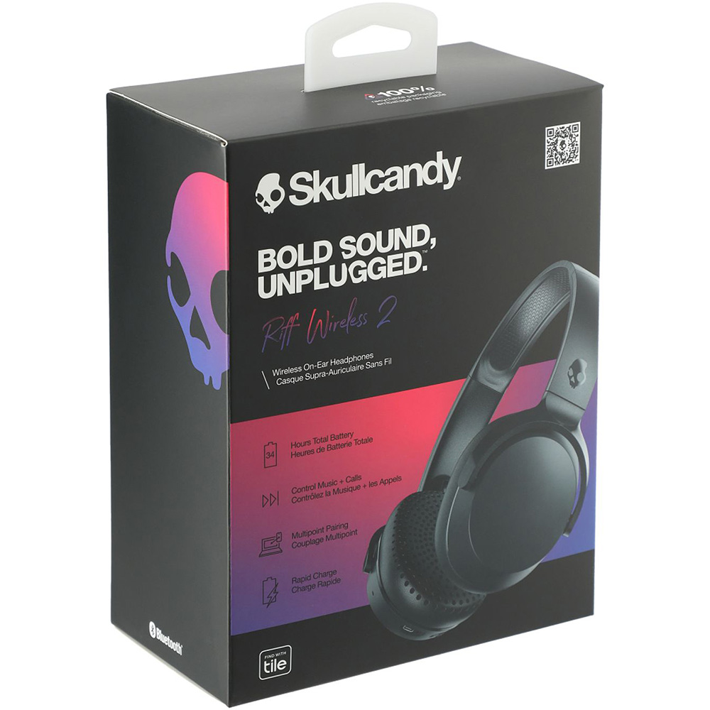 The Skullcandy Riff 2 Bluetooth Headphones can provide up to 34 hours of playback. The refined acoustic and custom EQ modes deliver a premium listening experience. The plush, oblong on-ear cushions provide all day comfort. The built-in microphone, multipoint pairing (connect to multiple devices), low-latency gaming mode, and built-in music controls make them a great option for anywhere. Rapid Charging provides 4 hours of playback time in 10 minutes. A complete charge takes 2 hours. Includes removable 3.5mm aux cable and Type-C charging cable.
