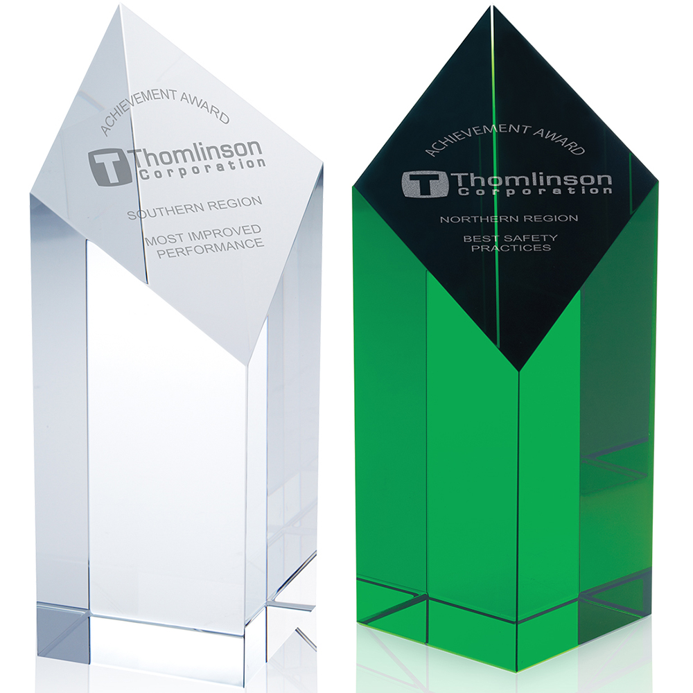Spectra Pillars dramatically emphasize the clarity and dimension of flawless optical crystal structure. Due to the handmade production method, these pieces may vary slightly in height and overall size. Base available; contact customer service for quote. Material: Optical Crystal. Price includes laser engraving.