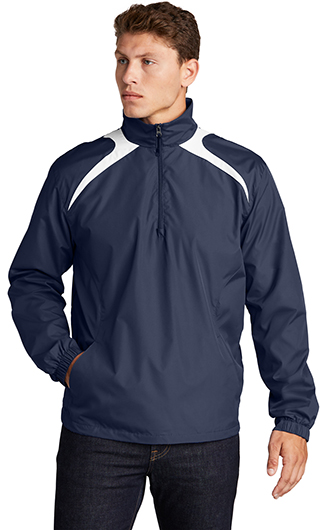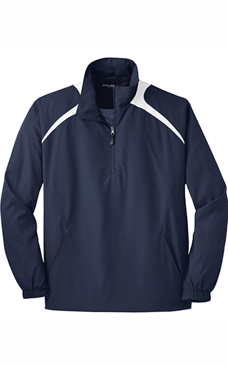 Our water-repellent wind shirt features a 1/2-zip front that lets you quickly adapt to weather changes. 100% polyester shell. 100% polyester jersey lining with mesh insets at gussets for added breathability. Articulated elbows for greater mobility. Half elastic, half self-fabric cuffs for comfort. Left side seam zipper for easy on/off. Front slash pockets. Drawcord hem with toggles. Price includes embroidery up to 5k stitches.