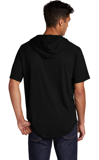 This short sleeve hoodie combines moisture-wicking performance, unbeatable softness and PosiCharge technology to lock in color. 4.4-ounce, 75/13/12 poly/cotton/rayon jersey with PosiCharge technology. 4.6-ounce, 75/13/12 poly/cotton/rayon jersey with PosiCharge technology (Black Triad Solid). Removable tag for comfort and relabeling. Self-fabric hood. Dyed-to-match neck taping. Raglan sleeves. Front pouch pocket. Price includes one color, one location imprint.