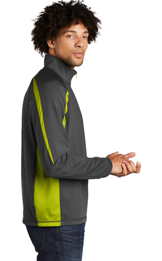 This soft-brushed pullover is stretchy and moisture-wicking with color splices and subtle texture. 6.8-ounce, 90/10 poly/spandex jersey. 100% polyester closed-hole mesh insets. Cadet collar. Tag-free label. Dyed-to-match Sport-Tek logo neck taping. Contrast color reverse coil zipper. Open cuffs and hem. Price includes embroidery up to 5k stitches.