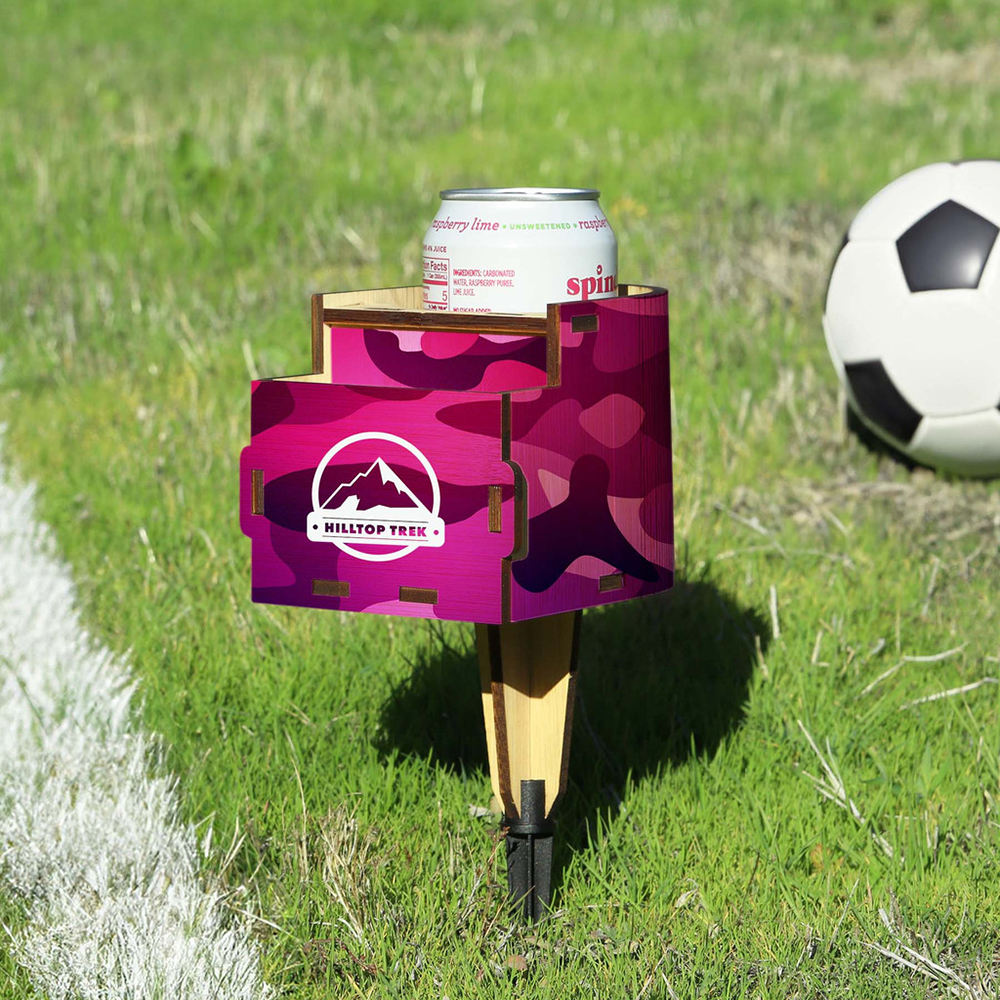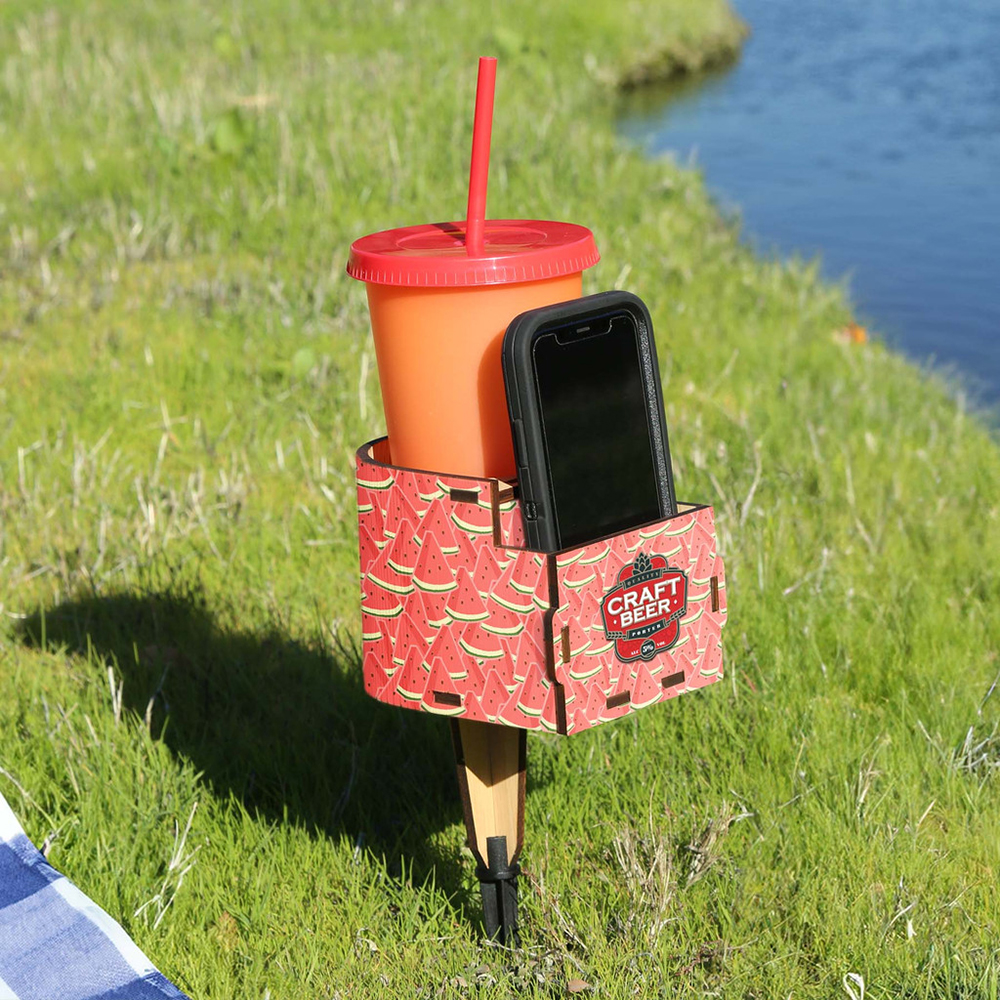 Meet the Stakeout Cup Holder: Your go-to outdoor companion. The Stakeout Cup Holder is a bamboo phone and cup holder. Spike it into sand or ground for a secure phone or cup. Enjoy hands-free convenience wherever you stake your claim. Outdoor ground stake cup holder. Holds up to 32 oz. drink. Bamboo construction. Front accessories compartment for phone, keys, wallet, & more. Front compartment can hold devices with screens up to 6.69?. Material: Bamboo. Product Size: 3 7/8? W x 5 3/8? L x 10 1/2? H x 3 1/2? D. Price includes full color imprint.