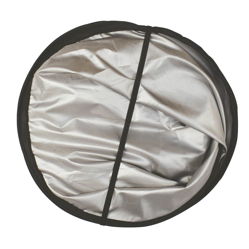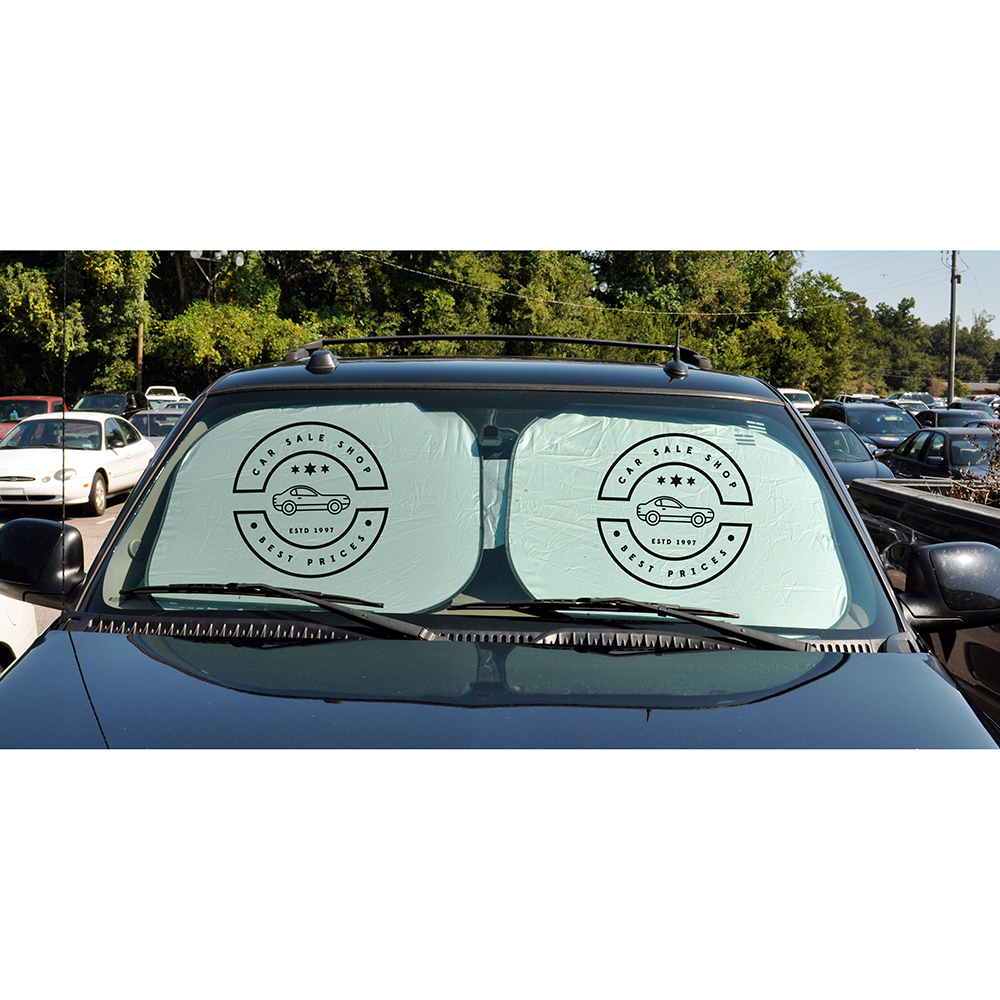 Light, reflective material to help keep automobile cool. Easy to open and install. Held in place with automobile sun visor. Actual size is 27"h x 56-3/16"w. Pops open and folds easily using elastic loop strap. Price includes one color, one location imprint.