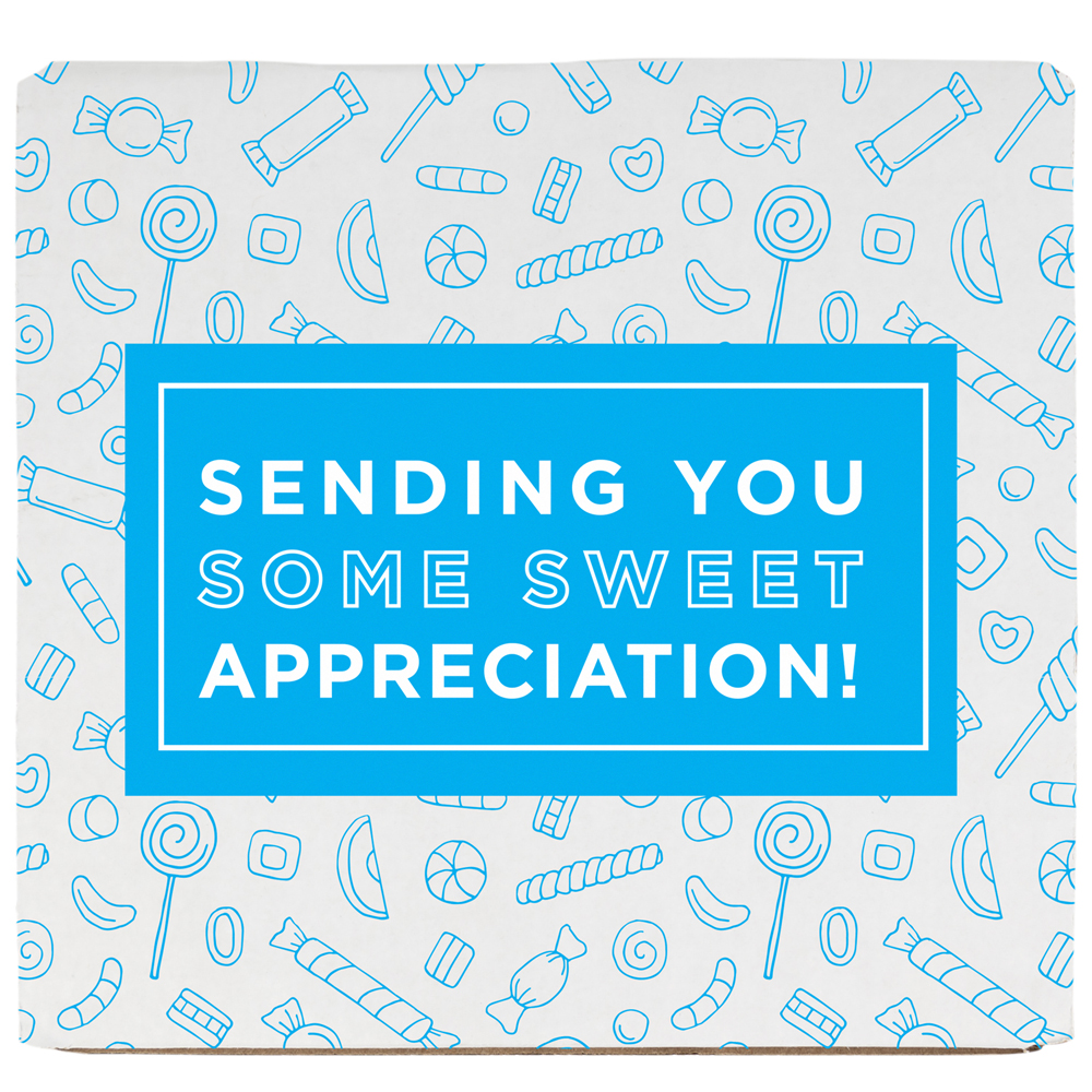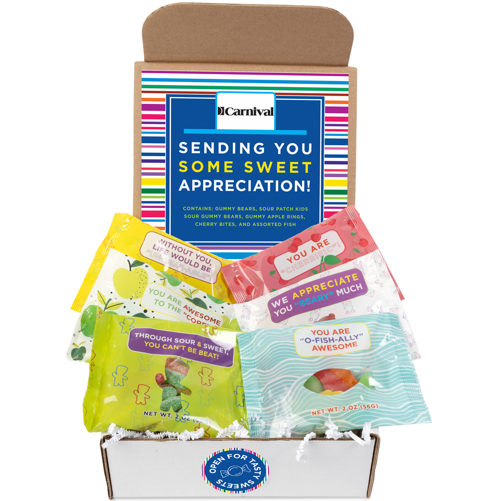 Our gummy candy mailer is filled with 6 different 2 oz. digibags of gummy candy. Mailer comes with sour gummy bears, gummy bears, assorted fish, gummy sour apple rings, cherry bites and sour buddies. Top of mailer box exclaims "Sending You Some Sweet Appreciation." Outside sticker states "Open for Tasty Sweets!" Comes packaged in a custom mailer box (stock design only as pictured), outside sticker and a customizable inside label. Price includes full color imprint.