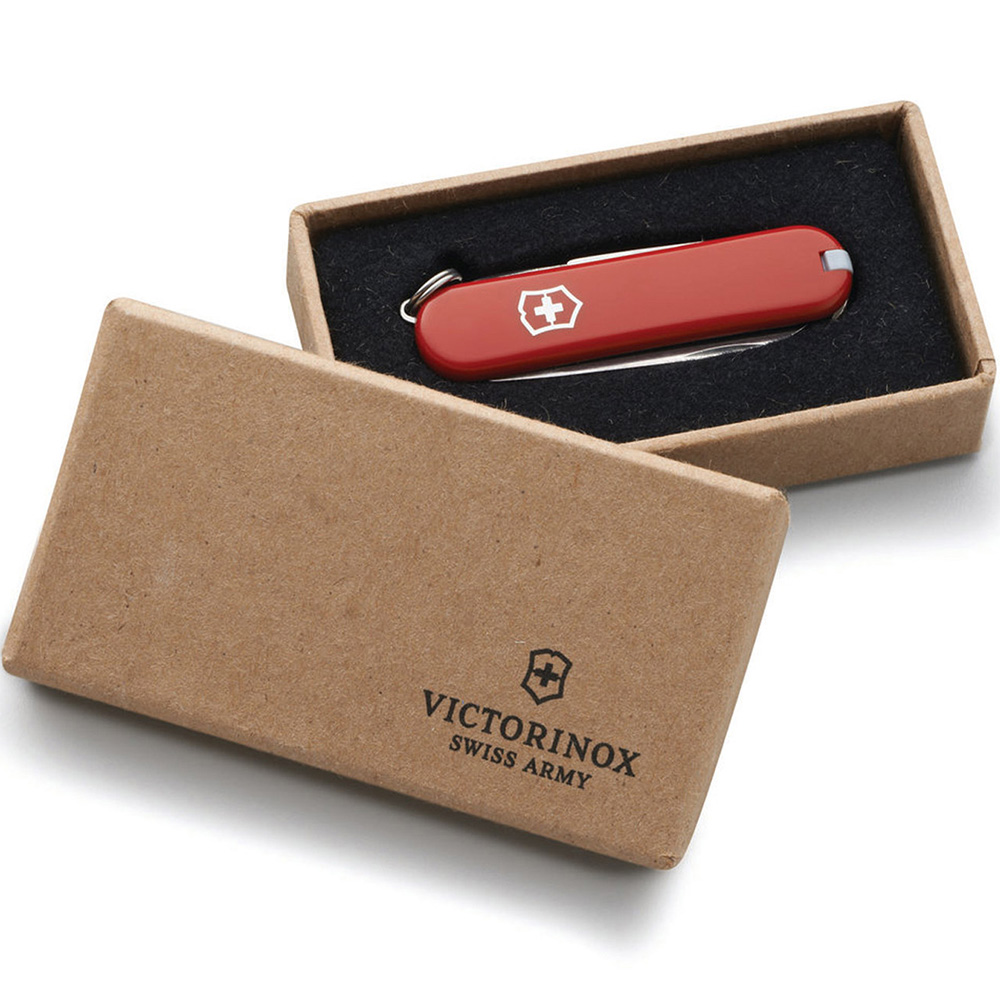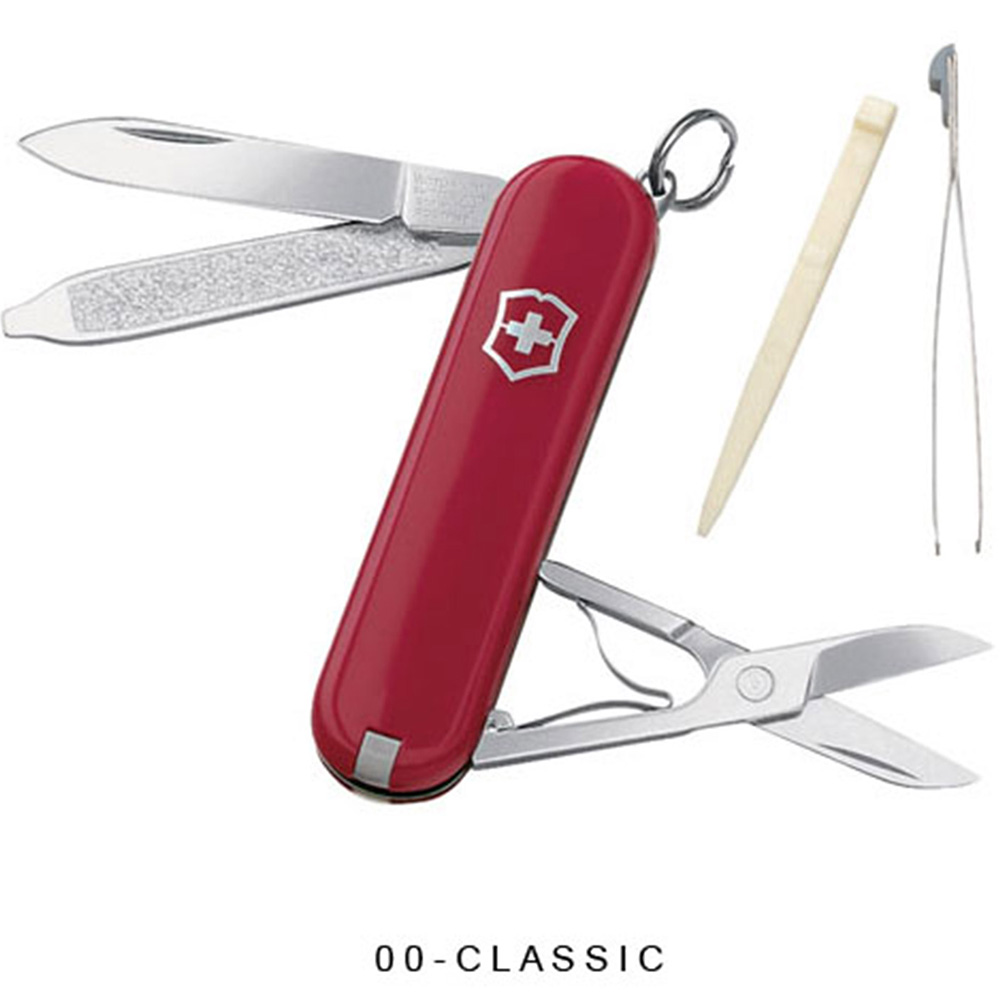 Victorinox’s most popular pocket knife. 2 1/4" Handle. Includes blade, scissors, nail file w/ screwdriver tip, key ring, tweezers and toothpick. Price includes one color, one location imprint.
