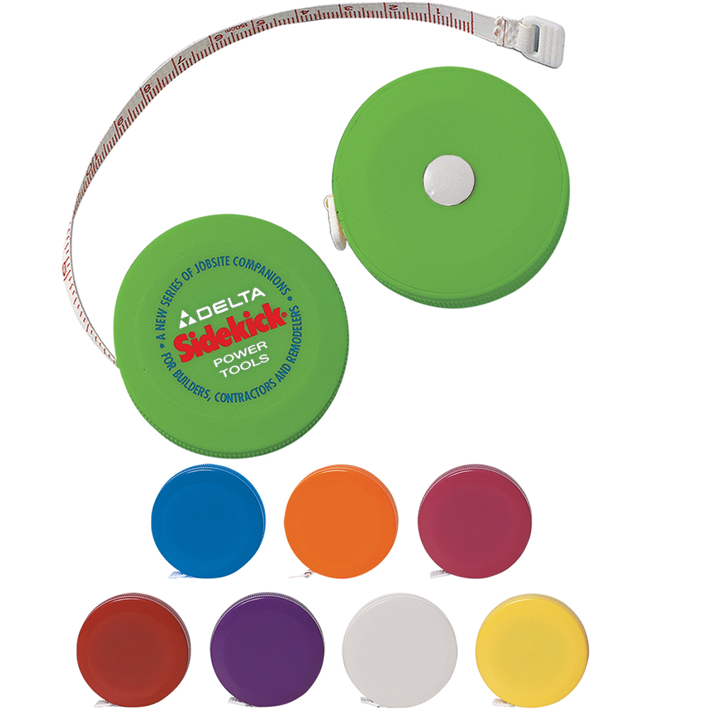 Handy tape a matic key tag gracefully combines key tag and tape measure for good use. A 60' cloth tape with Metric/Inch scale with retractable push button, auto lock. Available in 8 electric colors. Price includes a one color imprint, one location.
