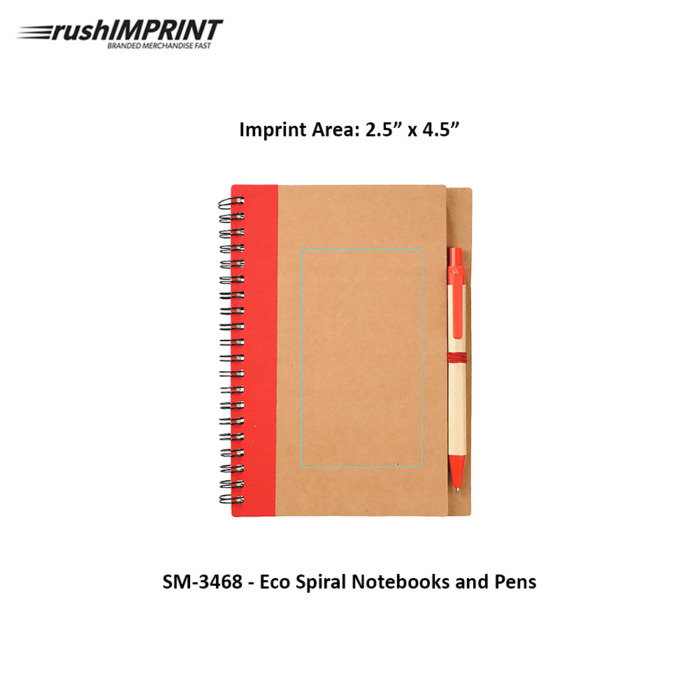 Custom notebooks measure 7" x 5.13" x 0.3" - 0.30 lbs. Request FREE ART PROOF to be emailed in 1 business day! Spiral notebook with matching ballpoint pen. Includes 60 ruled pages and matching color elastic pen loop. Imprint not available on pen. Price includes one color imprint, one location. Free rush production! Personalized notebooks min. of 75 pcs. Choose your pick from 5 color options! 4.5" x 2.5" imprint dimension. Free sample. rushIMPRINT it!
