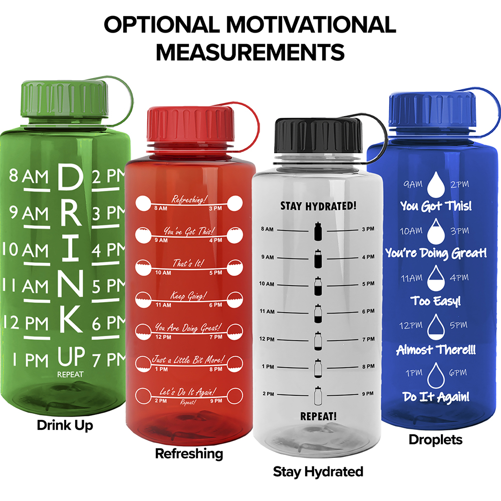 36 oz. Transparent bottle with Tethered lid. Essential for Any Outdoor Adventure. Extra Large Capacity. Rigid Wall Construction for Superior Durability. Great for Athletic facilities, Schools, Hospitals, Charity Events, and Gift shops! Molded with Durable, BPA-Free / FDA Compliant Tritan. Mix & Match bottle and lid colors. Will not retain Odor or Flavor. Ships assembled and individually poly-bagged at no extra charge. Top Rack dishwasher safe / do not microwave. Reusable Sports bottles that replace Single-use bottles are Eco-friendly. Blank orders do not come with Motivational Measurements. Price includes one color, one location imprint.
