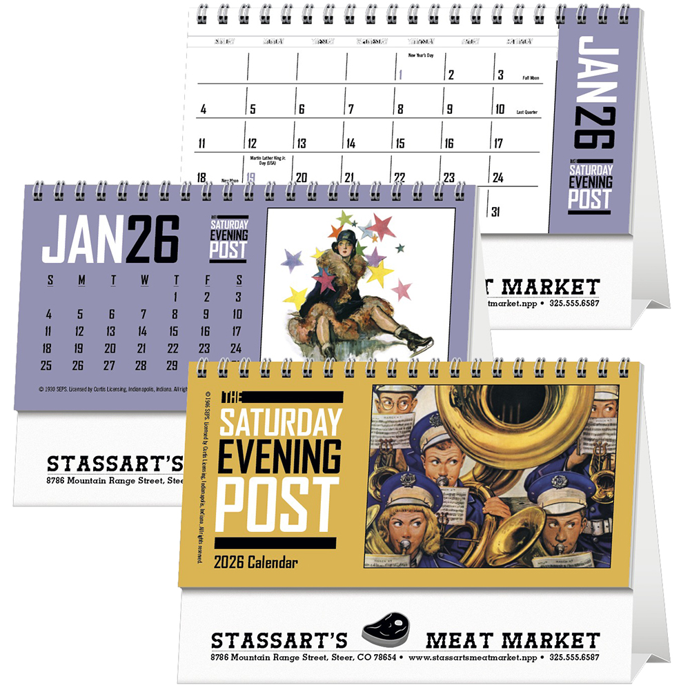 Model: 4252 The Saturday Evening Post Desk Calendar View Imprint Area Product Description The Saturday Evening Post desk calendar is a piece of history for every office. Same ad message prints on both sides of the tent mount. Top markets: insurance, financial, health care. Price includes one color, two location imprint. Size: 4.5"h x 6"w Imprint Area: 0.88"h x 5.25"w Request A Virtual Proof Request A Free Sample Choose Quantity View Price Breaks Quantity Price 100 $4.14 250 $3.54 500 $3.00 750 $2.64 1000 $2.40 2500 $2.01 5000 $1.76 Enter quantity or drag slider. Minimum quantity is 100. Quantity: Price Each $4.14 Setup Charge: $0.00 Subtotal $414.00 Savings: $ over minimum qty pricing Choose Your Quantity Quantity Price 100 $4.14 250 $3.54 500 $3.00 750 $2.64 1000 $2.40 2500 $2.01 5000 $1.76 Standard Production Time: 12 business days Select Delivery Date Enter ZIP Code Apply Loading... Choose a Shipping Method -- Loading Shipping Prices -- Customize it! Upload Your Art Now Or Send it Later. Select Imprint Color(s) Back to Edit Product Color And Quantity Where on the item should we print your design? 5.25" x 0.88" Available print design areas 5.25" x 0.88" What imprint Color(s) would you like? (Maximum # of Imprint Colors: 1) Black White Royal Blue Navy Blue Reflex Blue Light Blue Process Blue Teal Kelly Green Forest Green Lime Green Red Burgundy Maroon Orange Burnt Orange Yellow Athletic Gold Purple Pink Gray Brown Tan Black White Royal Blue Navy Blue Reflex Blue Light Blue Process Blue Teal Kelly Green Forest Green Lime Green Red Burgundy Maroon Orange Burnt Orange Yellow Athletic Gold Purple Pink Gray Brown Tan Quantity: 100 Add Your Artwork Add Artwork Add Now Send After Checkout Don’t have artwork? That’s ok! Artwork is not required to start a job. Simply skip this step and email us artwork later (helpdesk@claytonkendall.com). If you need assistance with your art, our designers can help with that too! Will I be able to approve my design before it goes into print? Yes! You will receive a digital mock-up of your artwork on this item within a few hours of placing your order. We will send your order into production only after you approve the mock-up. Only Image Aa Only Text Aa Text/Image Designer Contact Us Enter Your Text Choose file Uploading logo. Please wait... Personalize your design by adding text and customizing its shape with a curve. Upload your logo to give it a professional touch, and combine these elements to create a one-of-a-kind design that’s uniquely yours. Open Product Designer Don’t have artwork? That’s ok! Artwork is not required to start a job. Simply skip this step and email us artwork later. If you need assistance with your art, our designers can help with that too! Will I be able to approve my design before it goes into print? Yes! You will receive a digital mock-up of your artwork on this item within a few hours of placing your order. We will send your order into production only after you approve the mock-up. Free art proof will be emailed with every order within one business day Total (loading...) qty x Set Up Shipping Cost Rush Charge Custom Fields Hazmat Fee Estimate arrival Savings Add to Cart Updating Price...
