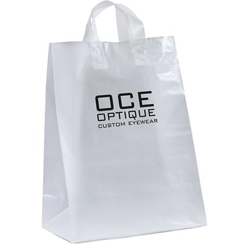 Hi-density frosted plastic bags with side and bottom gussets, fused loop handles, and cardboard bottom insert. Our ink imprinted Frosted Shoppers are printed while flat. For best results, your logo will be positioned between the fold of the bottom and the handles. Price includes one color imprint, one location. Free Proof prior to production.