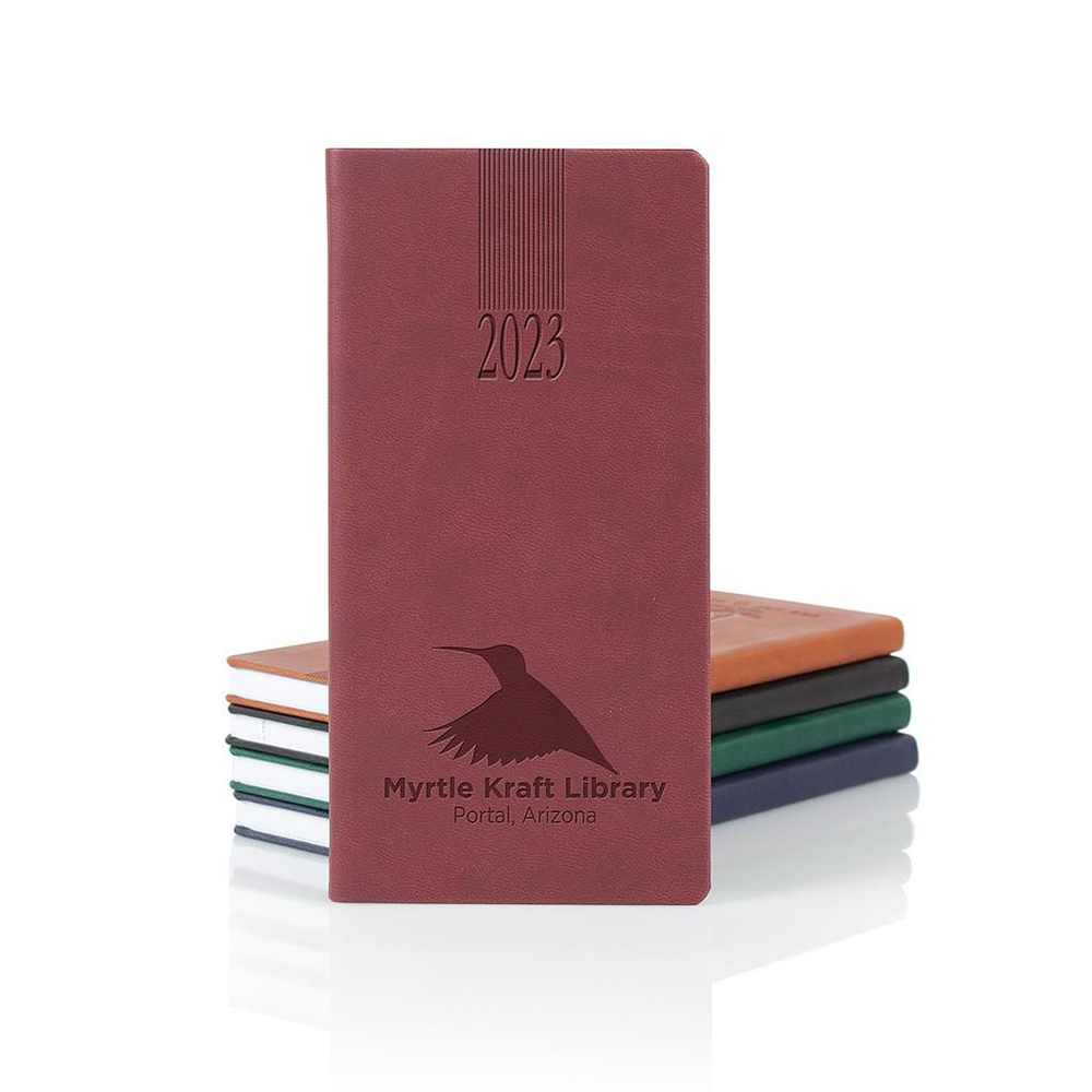 Stay on top of important dates and appointments with this pocket-sized upright weekly planner! Measuring 3 3/8" x 6 13/16", this planner features our most popular cover which has a smooth soft texture that's often mistaken for leather. Other features include 144 white pages printed in modern gray and blue, a silver ribbon marker with printed year date, perforated page corners and reference pages that include 4-color international maps, and an extensive reference section. Price includes debossing.