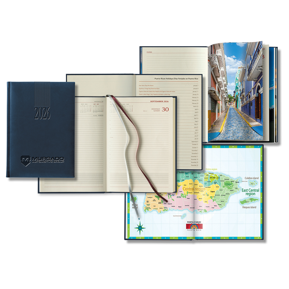 This Tucson Daily Planner. It features 12 full-color images of Puerto Rico at the beginning of each month and a map at the back. Inside of a cover that's commonly mistaken for leather, there are 416 cream lined pages with burgundy and gray print as well as a silver ribbon marker. This is great as part of a travel package. Add your logo and show your love of a beautiful locale! Price includes debossing.
