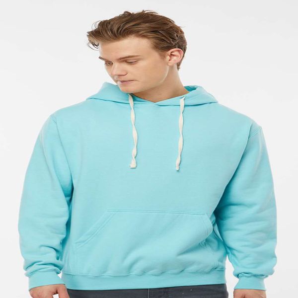 7.5 oz./yd2, 80/20 ring-spun cotton/polyester, 24 singles. Heather Grey is 75/25 ring-spun cotton/polyester. Forest, other Heathers, Light Pink, Maroon, Military Green, and Purple are 50/50 ring-spun cotton/polyester. Solid colors are 100% cotton face. Reactive-dyed for longer lasting color. Jersey-lined hood. Matching flat drawcord. Drop shoulder. Pouch pocket. Ribbed cuffs and waistband with 5% spandex. Tear away label. USMCA certified.