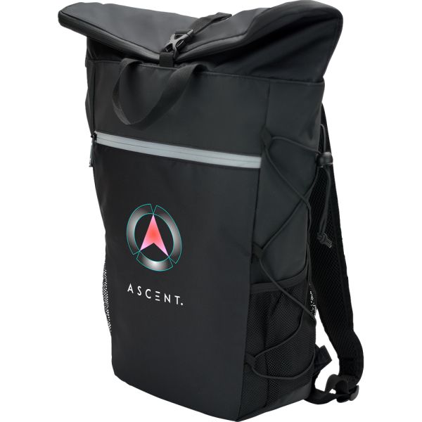 Constructed out of 55C PVC Mesh Tarpaulin, 38C PVC lining, 210D/PU insulation, and a 300D/PU pocket. Leak-resistant heat-sealed liner. Features a main zippered compartment with a roll-down, adjustable buckle closure, a front zippered pocket with reflective trim, mesh side pockets, one side bungee cord webbing with cinch closure, adjustable padded shoulder straps and webbed top handles. 1-year limited warranty. Price includes laser engraving. Price includes full color imprint.