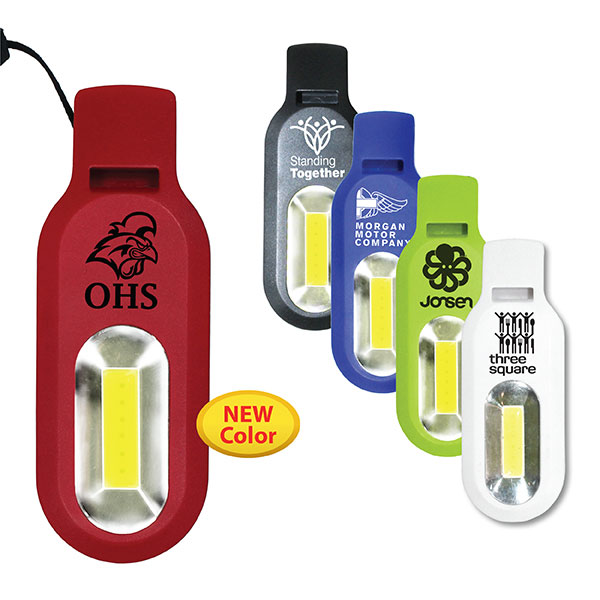 Powerful COB light - 130 Lumens. Push button on back to turn light on. Loud whistle to sound for help. Easy to carry wrist strap. Battery Included. Price includes one color, one location imprint.