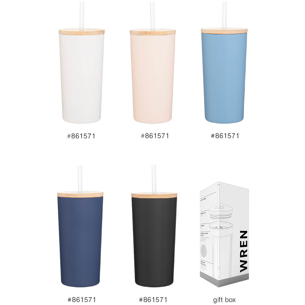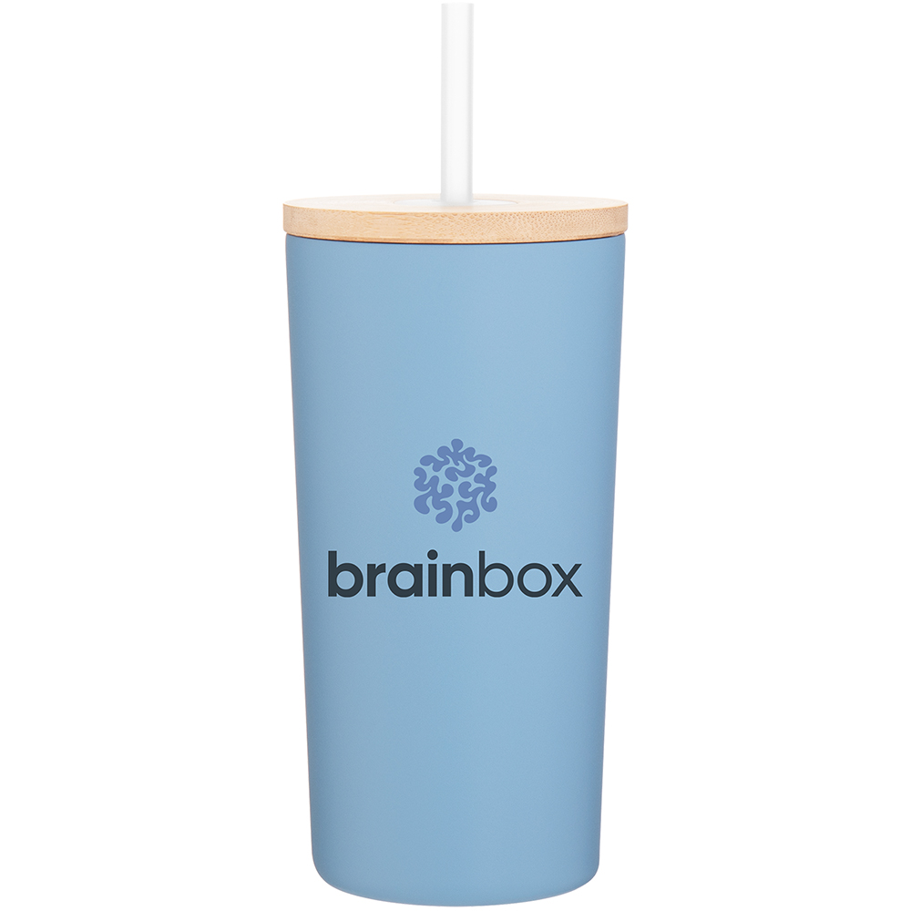 16.9 oz double wall 18/8 stainless steel tumbler with copper vacuum insulation, push-on bamboo lid, soft straw, and powder coated finish