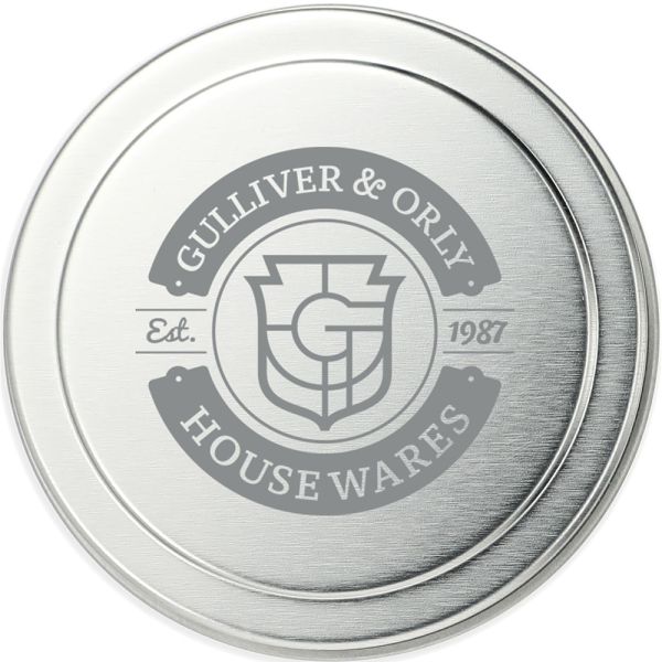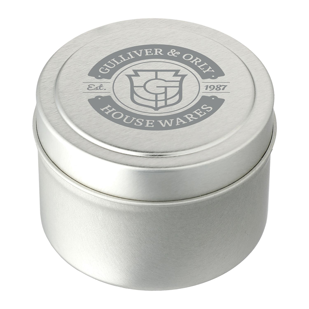 The Zen Tea 2.7oz Mini Tin Candle is made with food-grade soy wax and has a burn time of 23 hours. It is both phthalate- and lead-free with a single cotton wick. The scent includes juicy citrus with green floral and sweet fig notes. Materials: Tin. Price includes laser engraving.