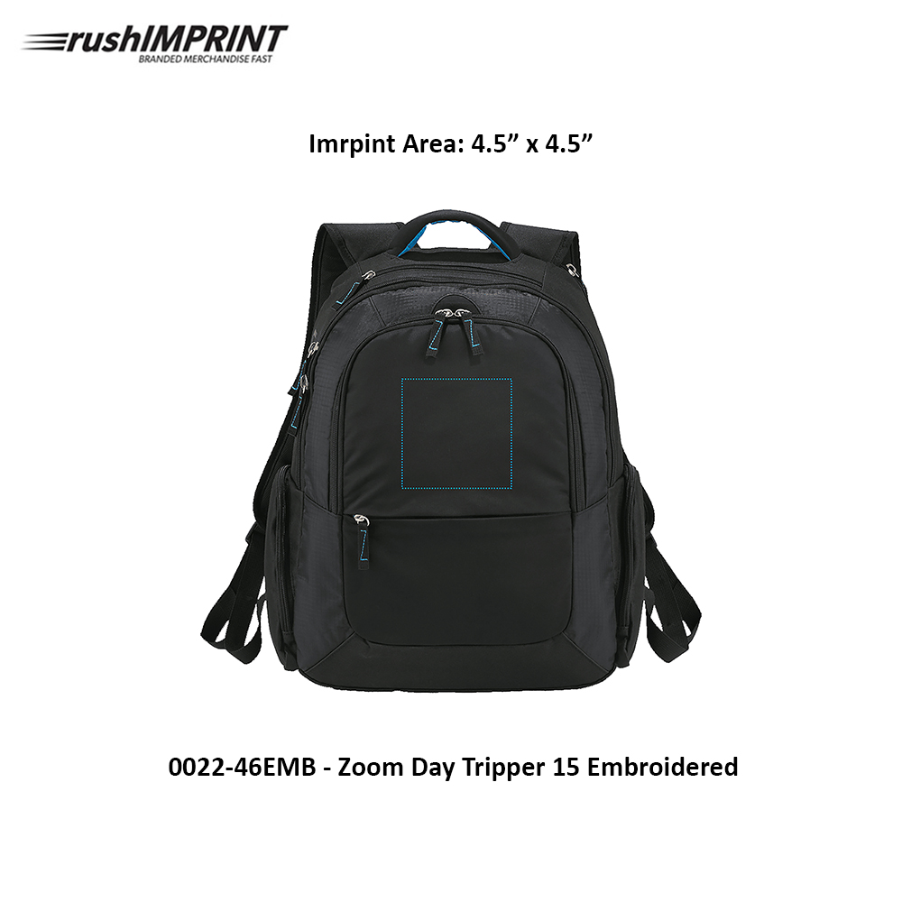 The Zoom® DayTripper 15" Computer Backpack is a lightweight daypack that includes a dedicated computer pocket that keeps laptops up to 16 inches safe and secure with side entry access. Open main compartment includes a dedicated zippered nylex-lined padded iPad pocket. A zippered top pocket has an organization panel and earbud port access while a zippered lower front pocket provides additional secure storage. Includes top zip lined valuables pocket that's perfect for sunglasses. Two side zippered pockets. Neoprene handle. Molded EVA back keeps the bag lightweight and allows ventilation down your back along with padded straps and smart phone holder. Back panel designed to slip over trolley handles. Signature Zoom lining and hardware.